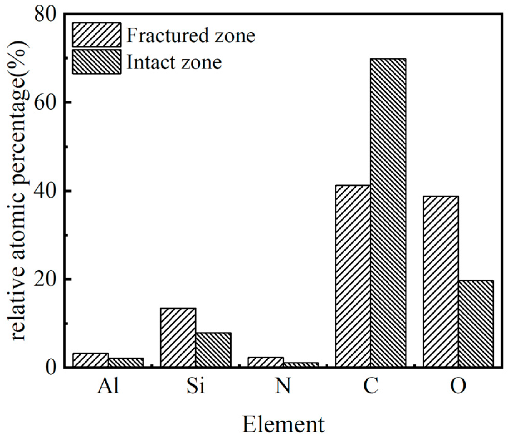 Figure 10. Compared with the intact zone, the fractured zone showed lower carbon content and higher oxygen content, implying oxidative decomposition of the epoxy resin in the degraded area. These results are consistent with the SEM, and FTIR findings, confirming the progressive aging and oxidation-driven deterioration of the core material during service.