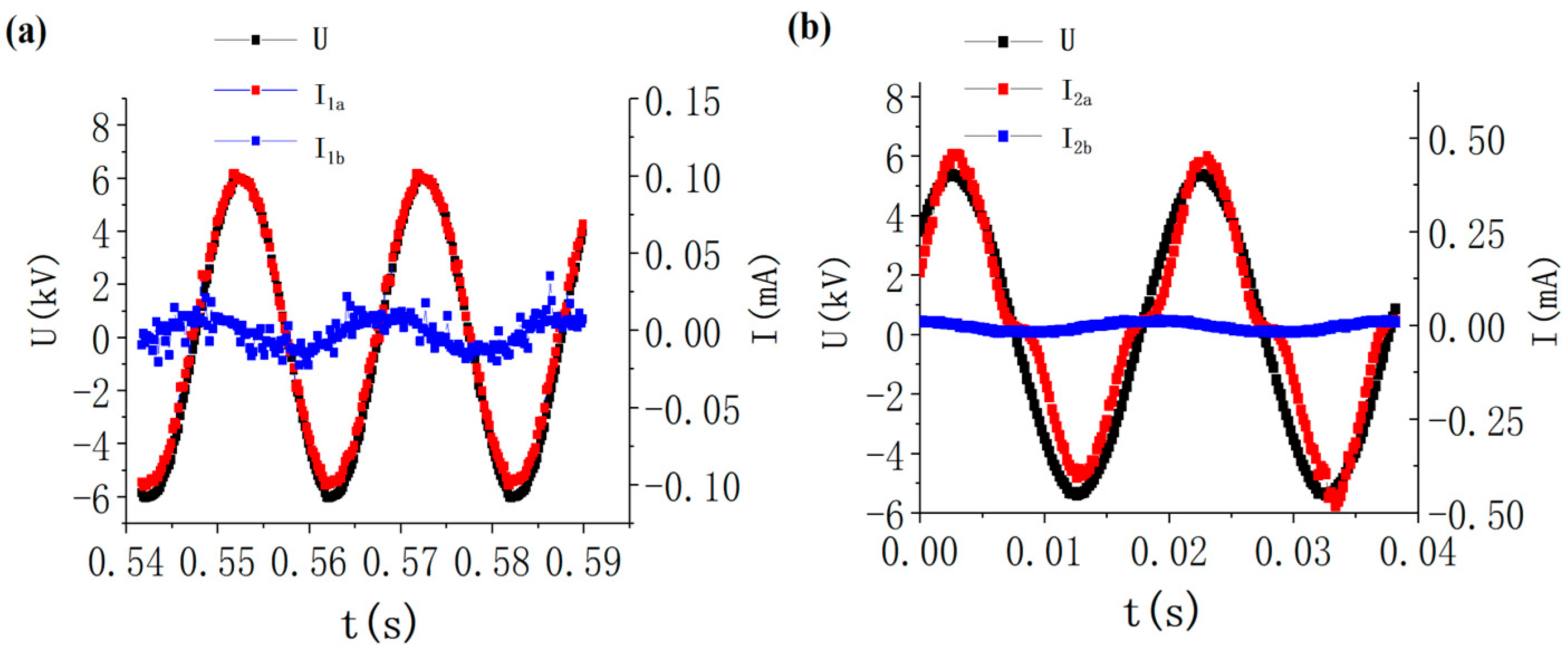 Compared with the b-type samples, the a-type samples exhibited a markedly higher leakage current, indicating that the degraded region more readily forms conductive paths. In the a-type samples, the voltage and current were nearly in phase, suggesting that the current was mainly resistive rather than capacitive. In contrast, the leakage current of the b-type samples remained very small, reflecting the dense and continuous surface/interface structure of the intact region.
