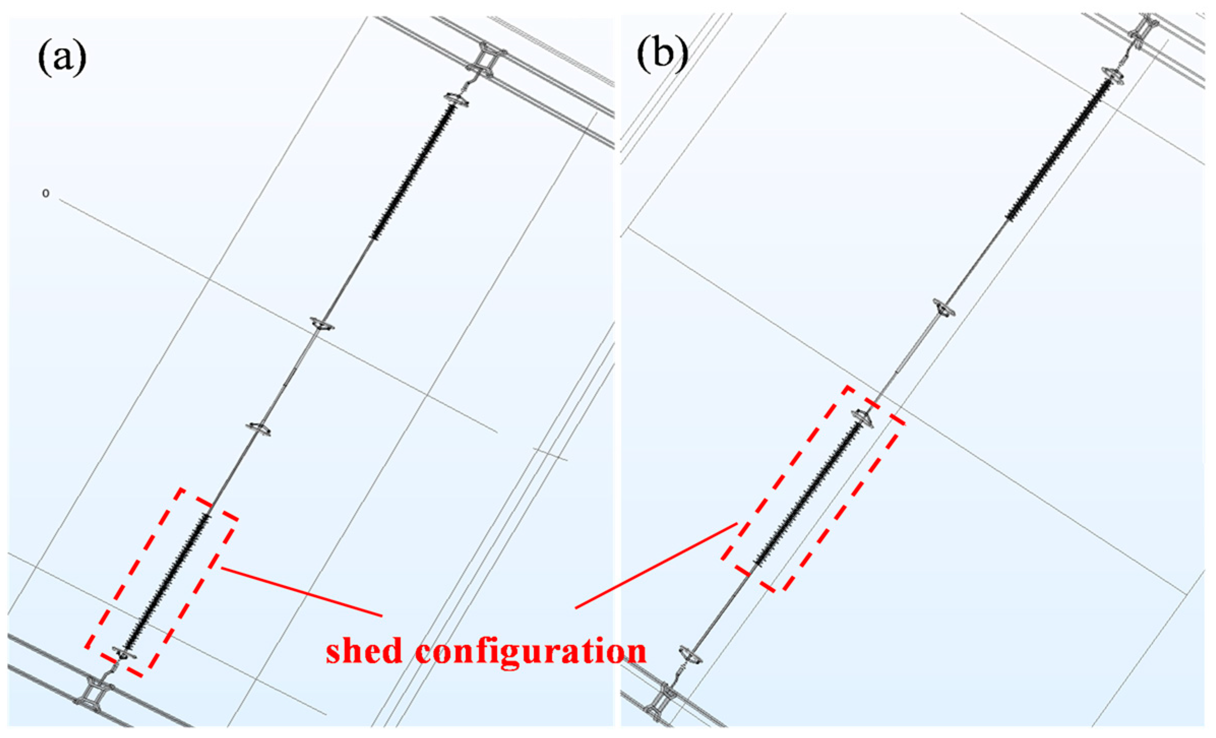 To evaluate the influence of shed configuration on the electric field distribution of the interphase spacer, two geometric models were constructed in COMSOL 6.3 Multiphysics, as illustrated in