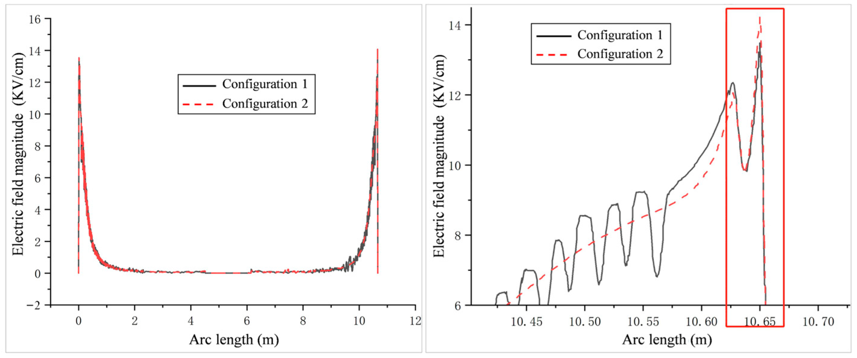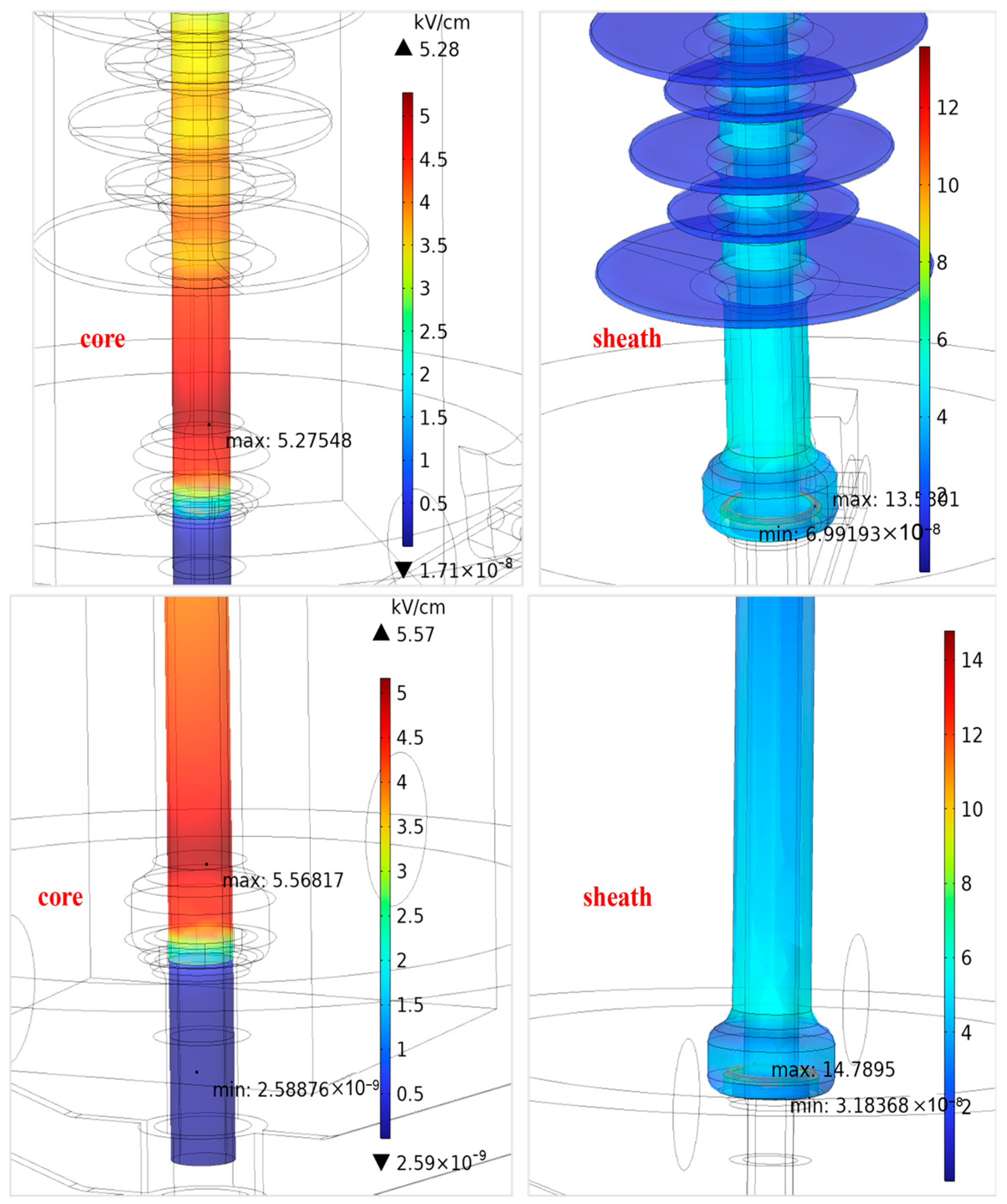 Table 4, the maximum electric field on the sheath surface was 13.53 kV/cm for Configuration 1 and 14.79 kV/cm for Configuration 2. The corresponding values on the core surface were 5.28 kV/cm and 5.57 kV/cm, representing increases of 9.3% and 5.5%, respectively, when the sheds were rearranged to the symmetric layout. The enhancement was confined mainly to a zone extending about 20–30 cm from the high-voltage terminal, as illustrated in