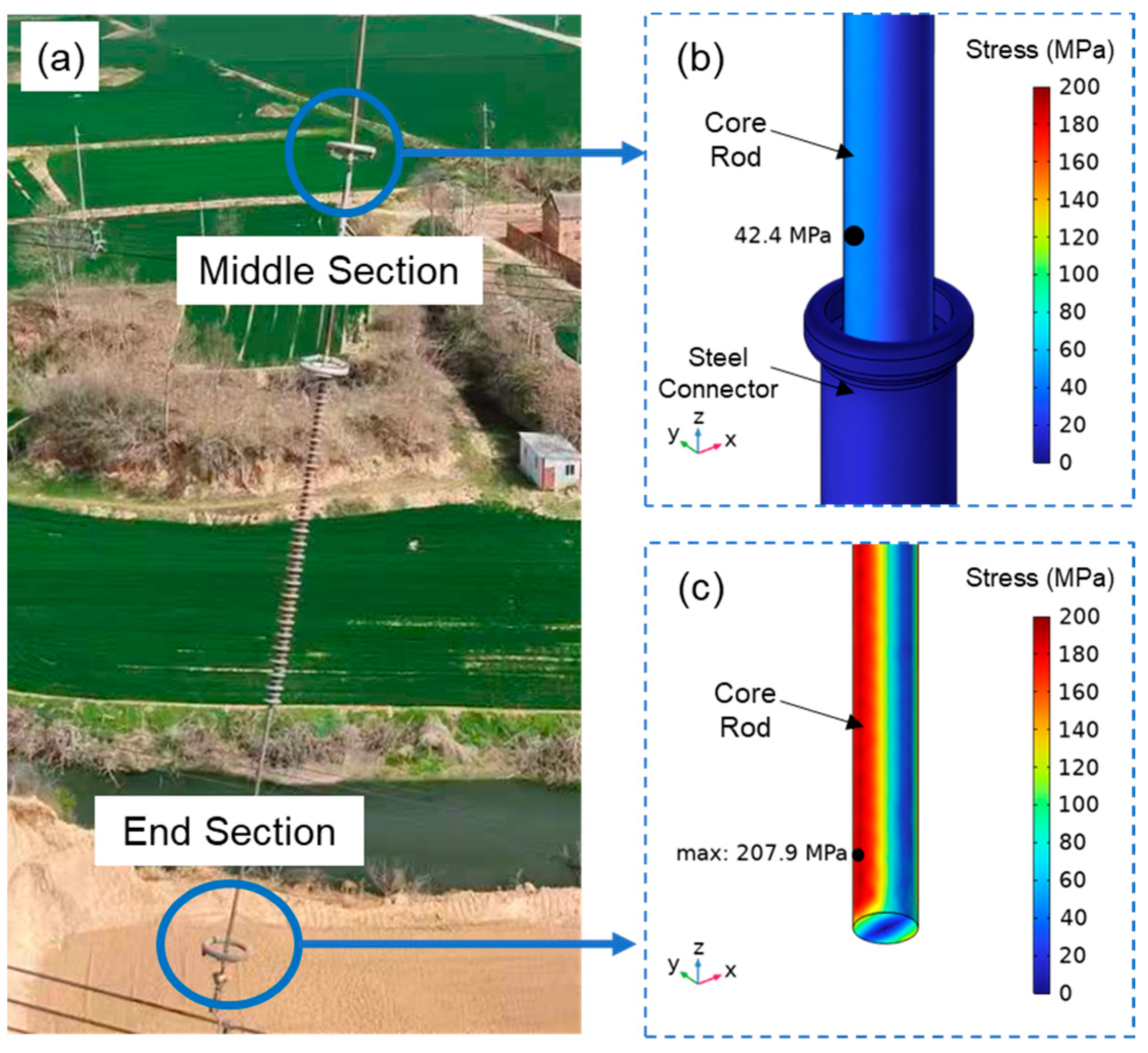 Figure 15b,c, which firstly indicates that the core rod suffers a stress concentration at the surface of both +X and −X direction, which is a typical pattern for the flexural load. Moreover, even with a relatively small flexural load (10 N), the maximum stress of core rod still reaches to 207.9 MPa at the end section of the interphase bar, which is about 20% of the failure stress (~1000 MPa) of fiber-reinforced epoxy rod. Considering that the mechanical load of on-site interphase bar can be higher and temporally variated, the mechanical stress can also be higher than the simulated value, which may lead to long-term fatigue of the core rod under the combination of electrical, mechanical, thermal and chemical stress. In addition, the stress level at the end part is 4.90 times higher than the value of middle section, indicating that the degradation of the end part is also easier than the middle part, which is also coherent to the electric field simulation results (also demonstrates “end-part concentration”) in