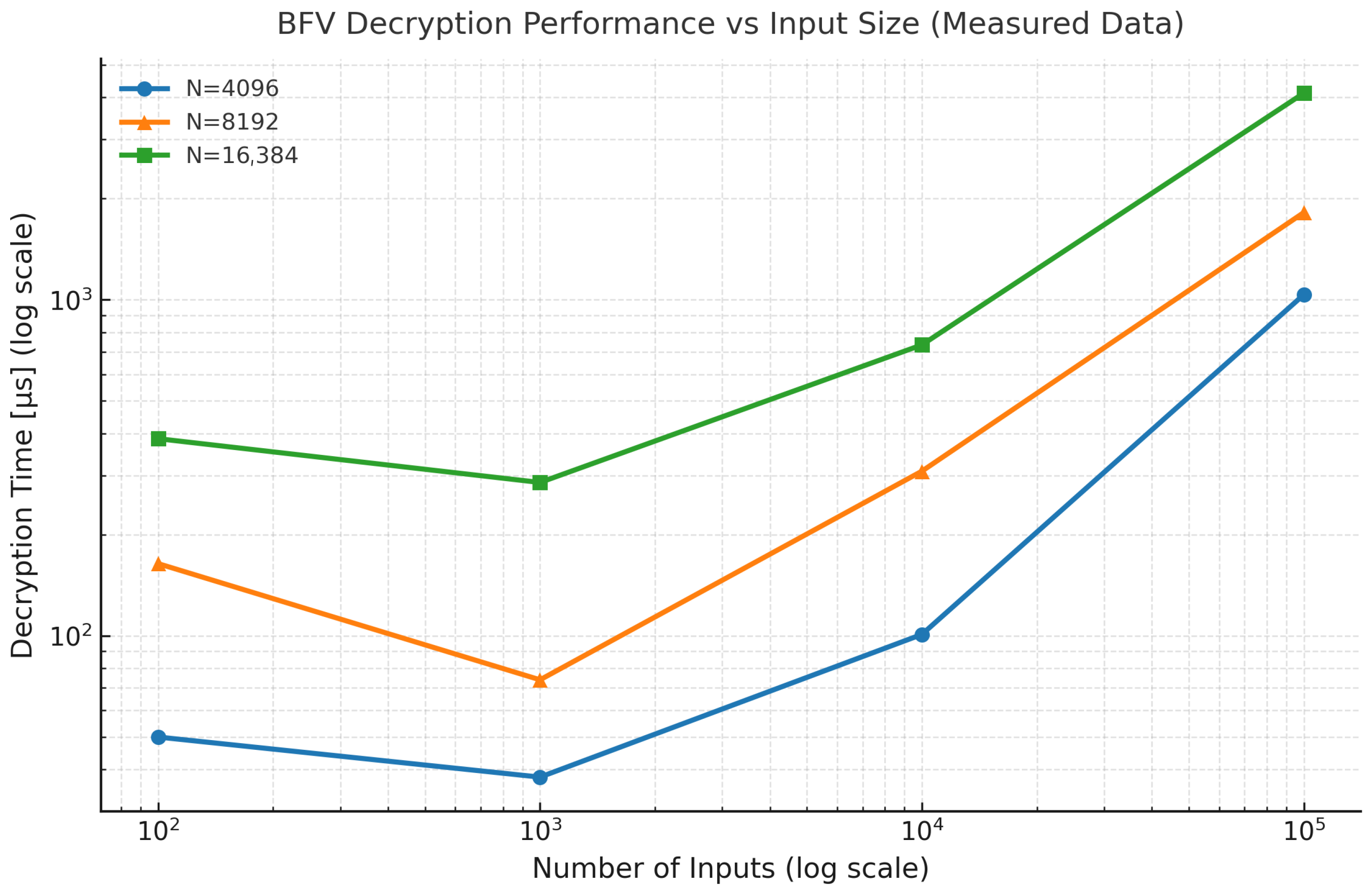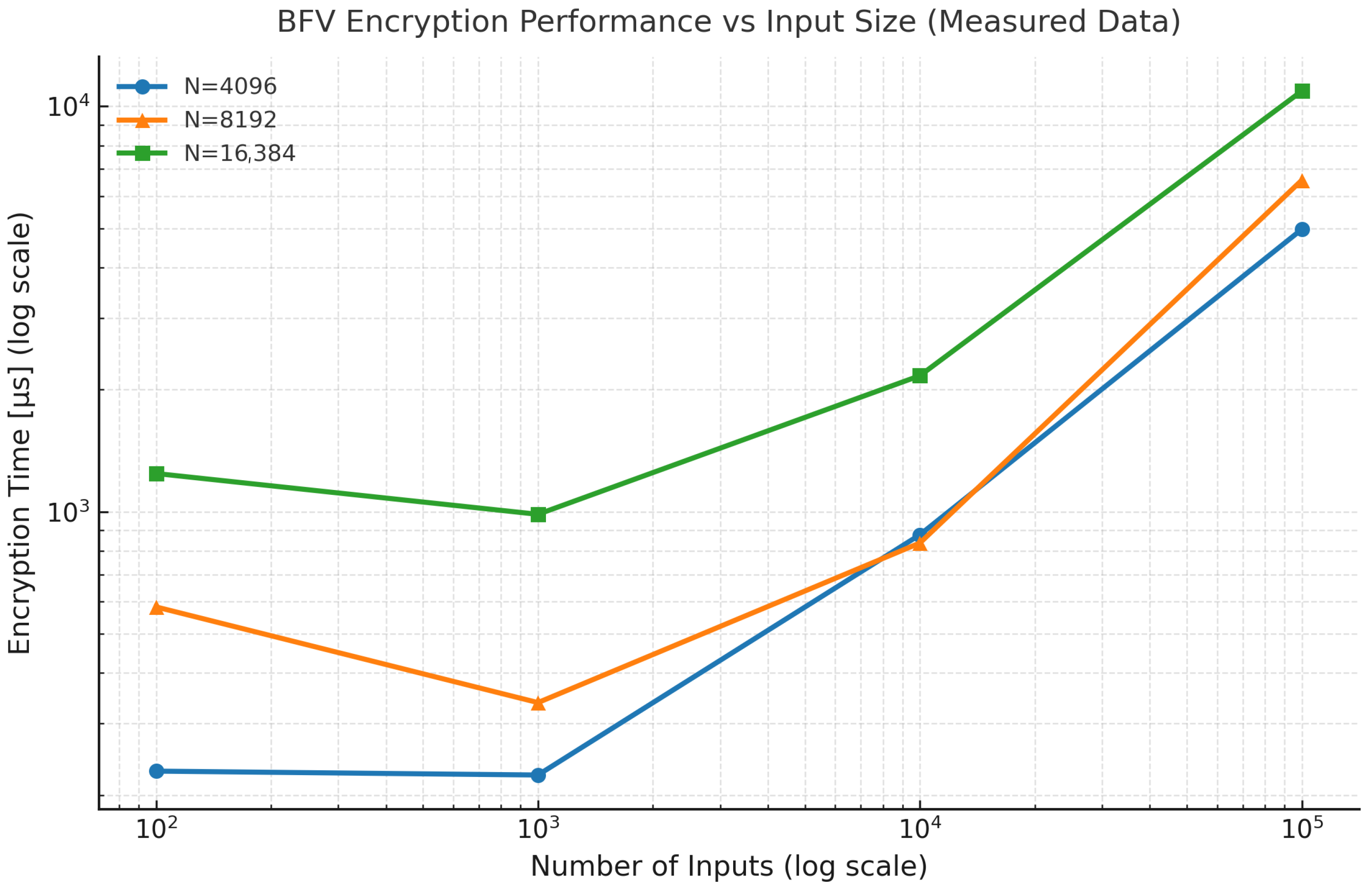 The effect of the polynomial modulus degree (N) and input size on the computational efficiency of the BFV scheme was analyzed using the Microsoft SEAL library. Random integer datasets of varying sizes (100, 1000, 10,000, and 100,000 elements) were encrypted and decrypted to evaluate execution time (in µs), ciphertext size (in MB), and peak memory consumption (in MB). This experiment aimed to assess the scalability of BFV encryption with respect to the number of inputs and parameter configuration.