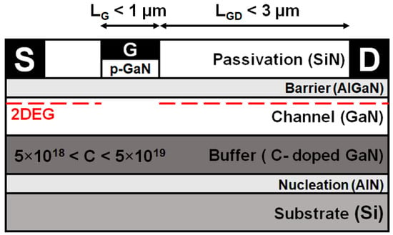 - Uren, M.J.; Silvestri, M.; Casar, M.; Hurkx, G.A.M.; Croon, J.A.; Sonsky, J.; Kuball, M. Intentionally Carbon-Doped AlGaN/GaN HEMTs: Necessity for Vertical Leakage Paths. IEEE Electron. Device Lett. 2014, 35, 327–329. [Google Scholar] [CrossRef]