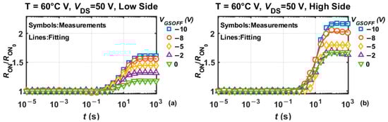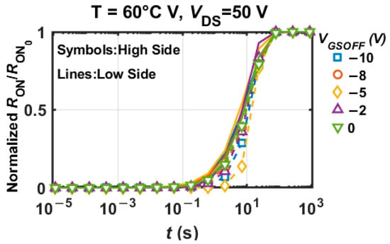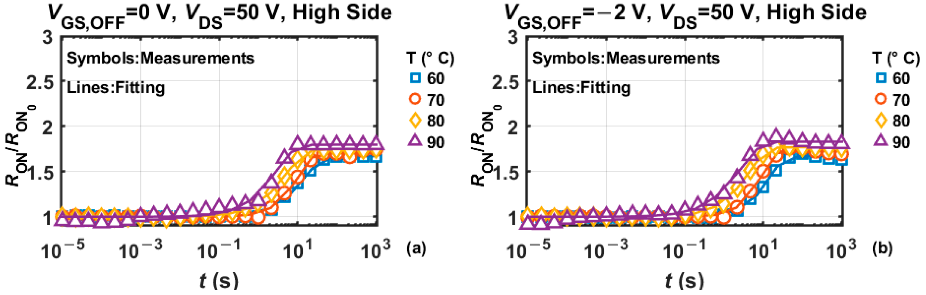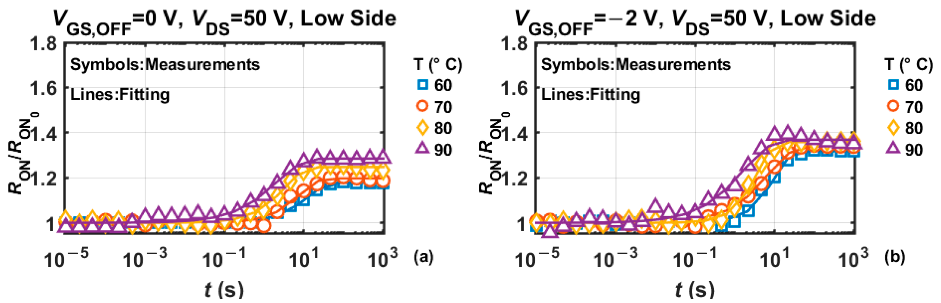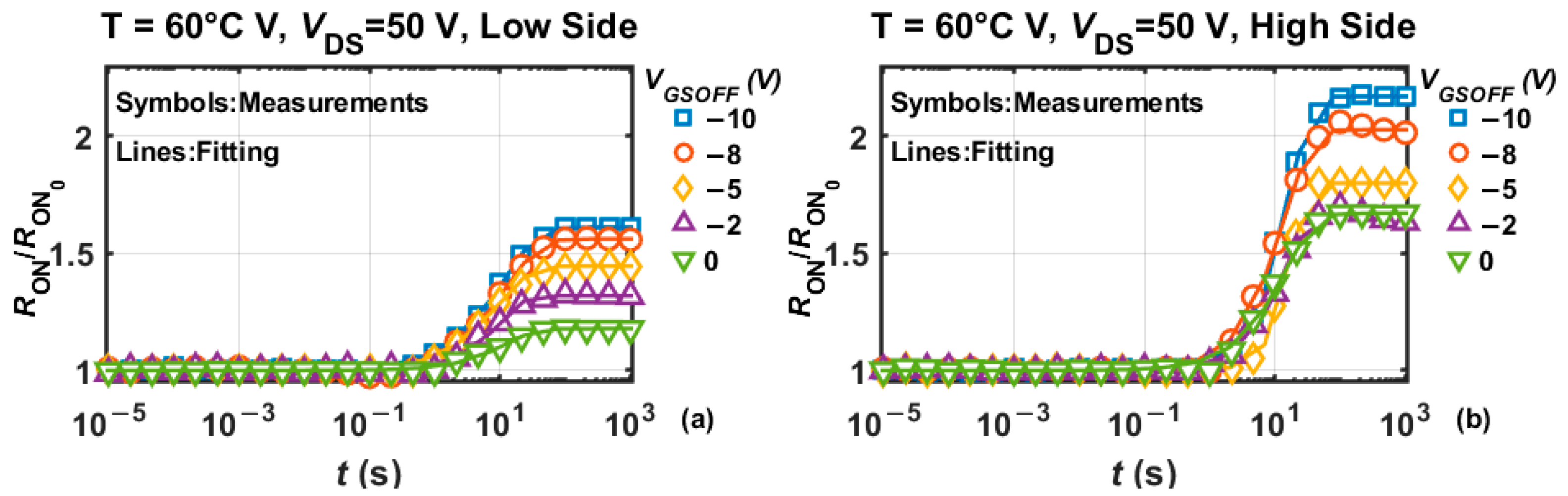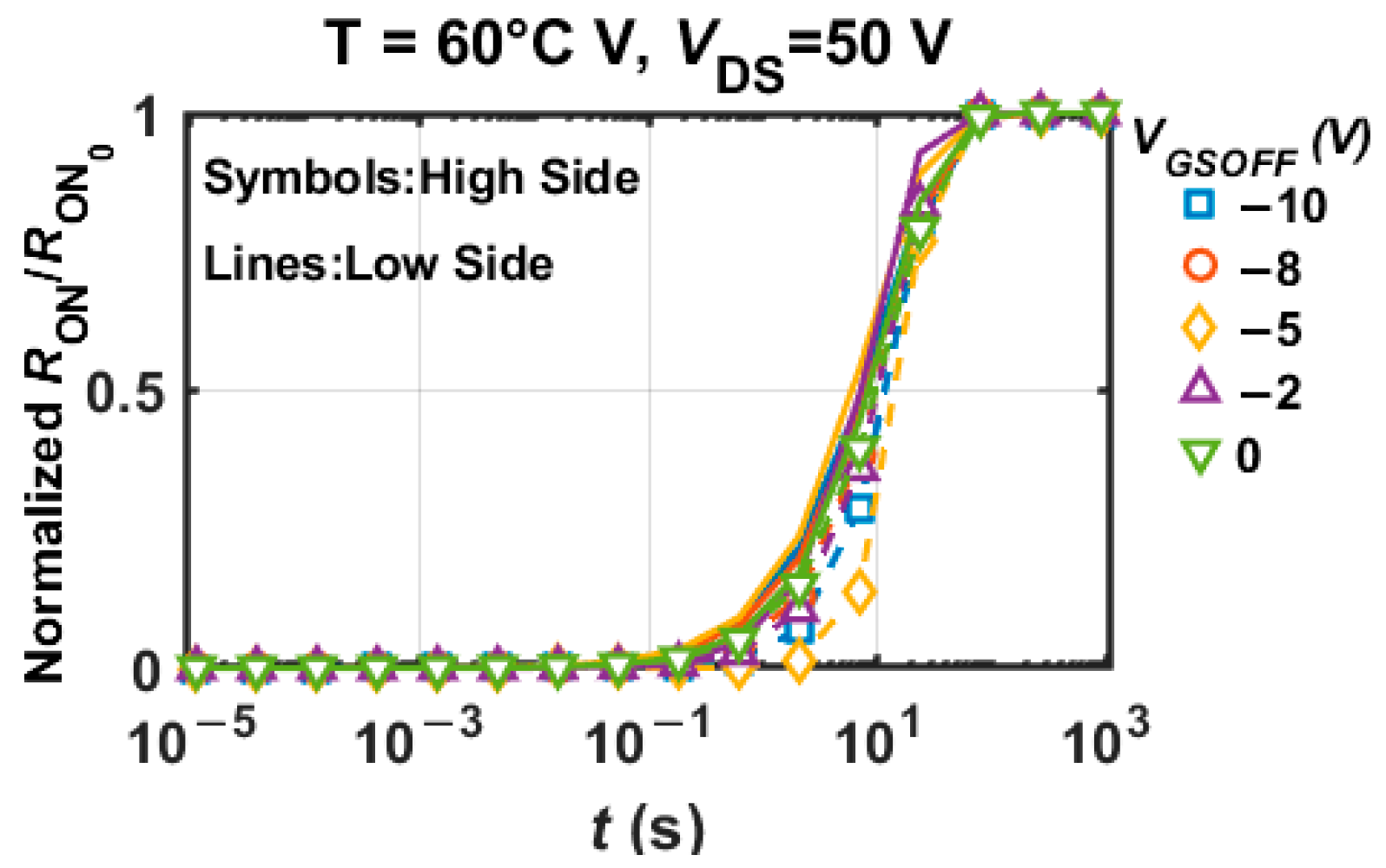 - Jiang, Z.; Hua, M.; Huang, X.; Li, L.; Chen, J.; Chen, K.J. Impact of OFF-state Gate Bias on Dynamic RON of p-GaN Gate HEMT. In Proceedings of the 2021 33rd International Symposium on Power Semiconductor Devices and ICs (ISPSD), Nagoya, Japan, 30 May–3 June 2021; IEEE: New York, NY, USA, 2021; pp. 47–50. [Google Scholar]