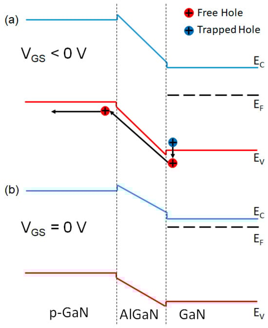 - Canato, E.; Meneghini, M.; De Santi, C.; Masin, F.; Stockman, A.; Moens, P.; Zanoni, E.; Meneghesso, G. OFF-state trapping phenomena in GaN HEMTs: Interplay between gate trapping, acceptor ionization and positive charge redistribution. Microelectron. Reliab. 2020, 114, 113841. [Google Scholar] [CrossRef]