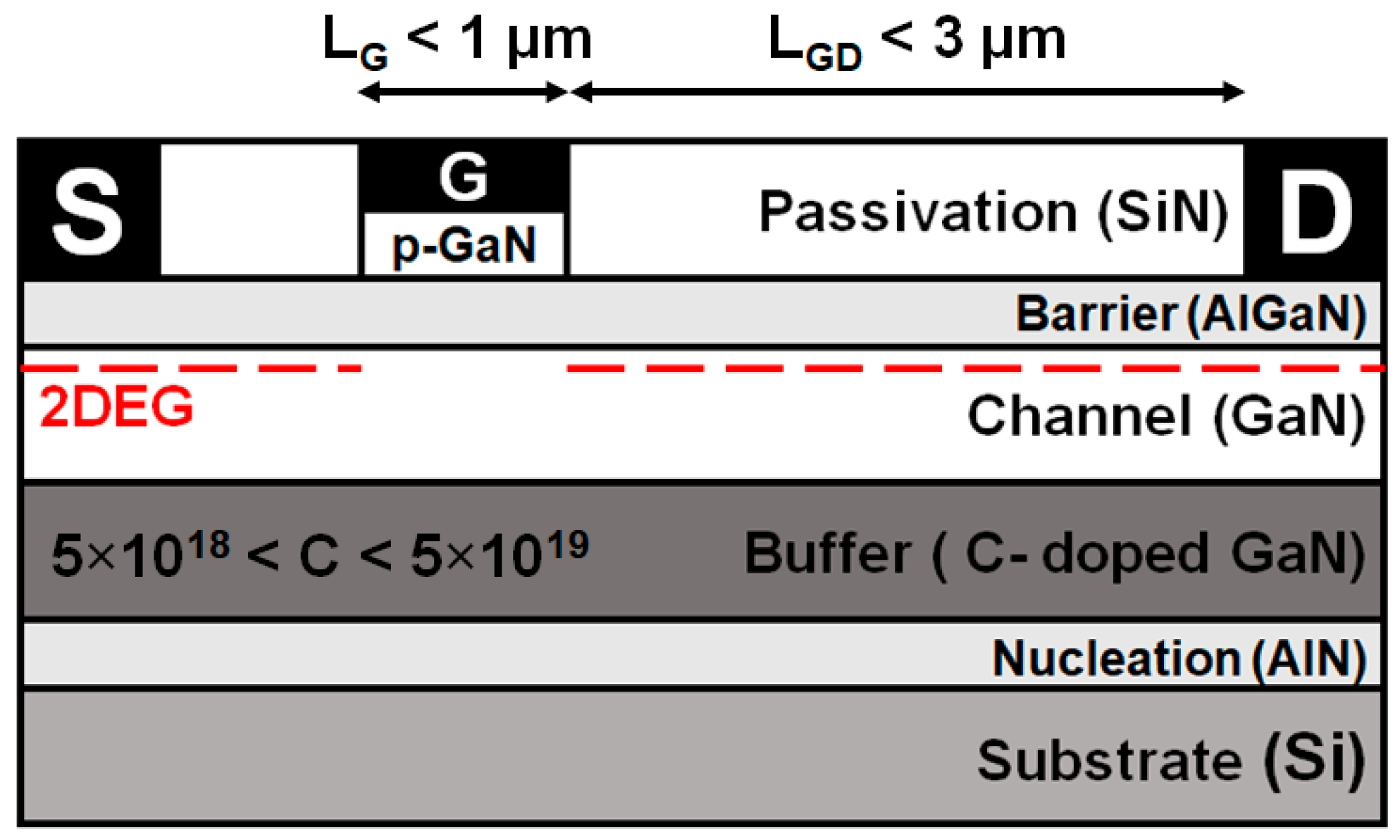 - Cioni, M.; Giorgino, G.; Chini, A.; Miccoli, C.; Castagna, M.E.; Moschetti, M.; Tringali, C.; Iucolano, F. Evidence of Carbon Doping Effect on VTH Drift and Dynamic-RON of 100V p-GaN Gate AlGaN/GaN HEMTs. In Proceedings of the 2023 IEEE International Reliability Physics Symposium (IRPS), Monterey, CA, USA, 26–30 March 2023; IEEE: New York, NY, USA, 2023; pp. 1–5. [Google Scholar]