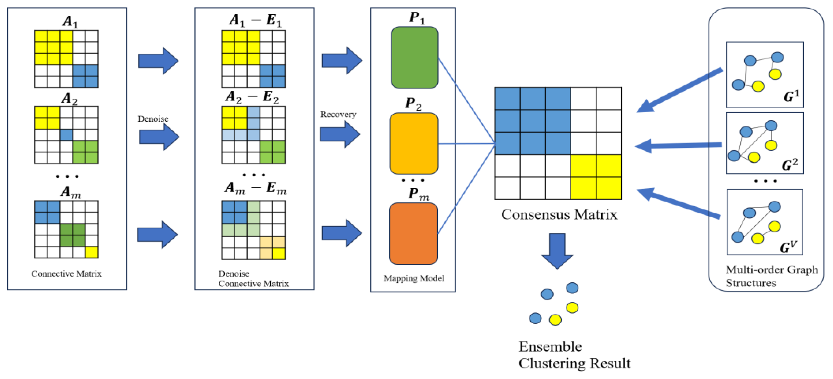 - Multi-order graph structures are designed to fully exploit the association relationships between samples in the feature space, thereby enhancing the structural quality of the consensus matrix.