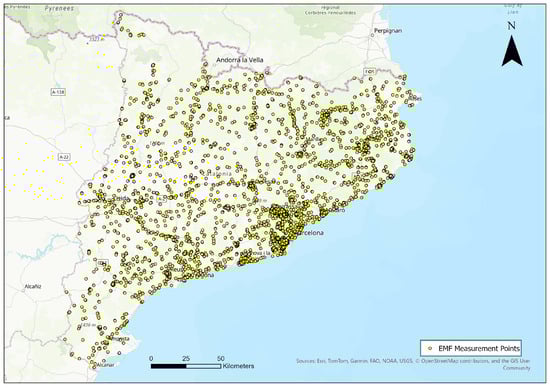 Spatial distribution of EMF (Electromagnetic Field) measurement points across Catalonia, Spain.