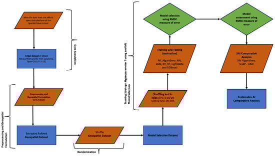 This study follows a structured, reproducible workflow designed to ensure robust electromagnetic field (EMF) prediction and model interpretability, integrating geospatial preprocessing, systematic ML benchmarking, and dual XAI evaluation (Figure 2). The workflow begins with raw EMF measurements from the official Spanish governmental open-data platform, followed by comprehensive quality control including missing-value handling, physical-plausibility checks, distributional inspection, and robust outlier filtering techniques. All geospatial variables are formalized and enriched with refined urban-morphology attributes from the GHSL Data Package 2023, producing a unified spatial dataset suitable for ML experimentation.