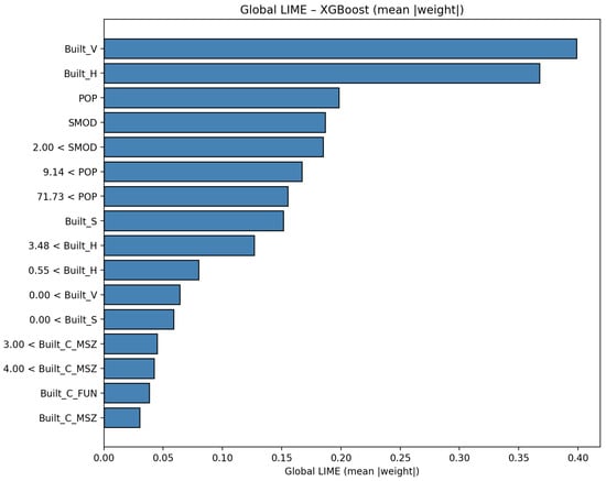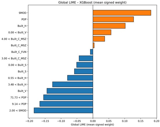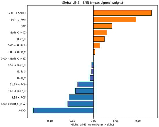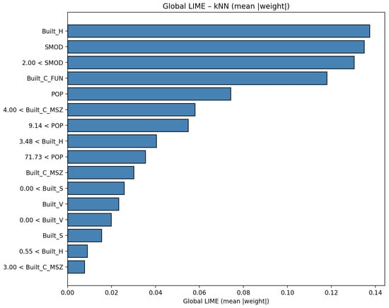 The interpretability analysis converged on a consistent physical interpretation. Across the top performing model methods, Built_H (building height), Built_V (built volume), POP (population density), and SMOD (degree of urbanisation) emerged as primary determinants of EMF levels, with Built_S, Built_C_MSZ, and Built_C_FUN providing secondary structural context attributions. SHAP exposed globally stable attribution patterns, particularly for XGBoost, highlighting attenuation and propagation effects tied to vertical density and demographic intensity, whereas LIME illuminated locally contingent behaviors, especially for kNN, where neighborhood-specific morphology modulates predictions. The alignment of SHAP and LIME with radio-propagation intuition strengthens confidence in the learned relations and supports the scientific validity of the models’ decision processes.