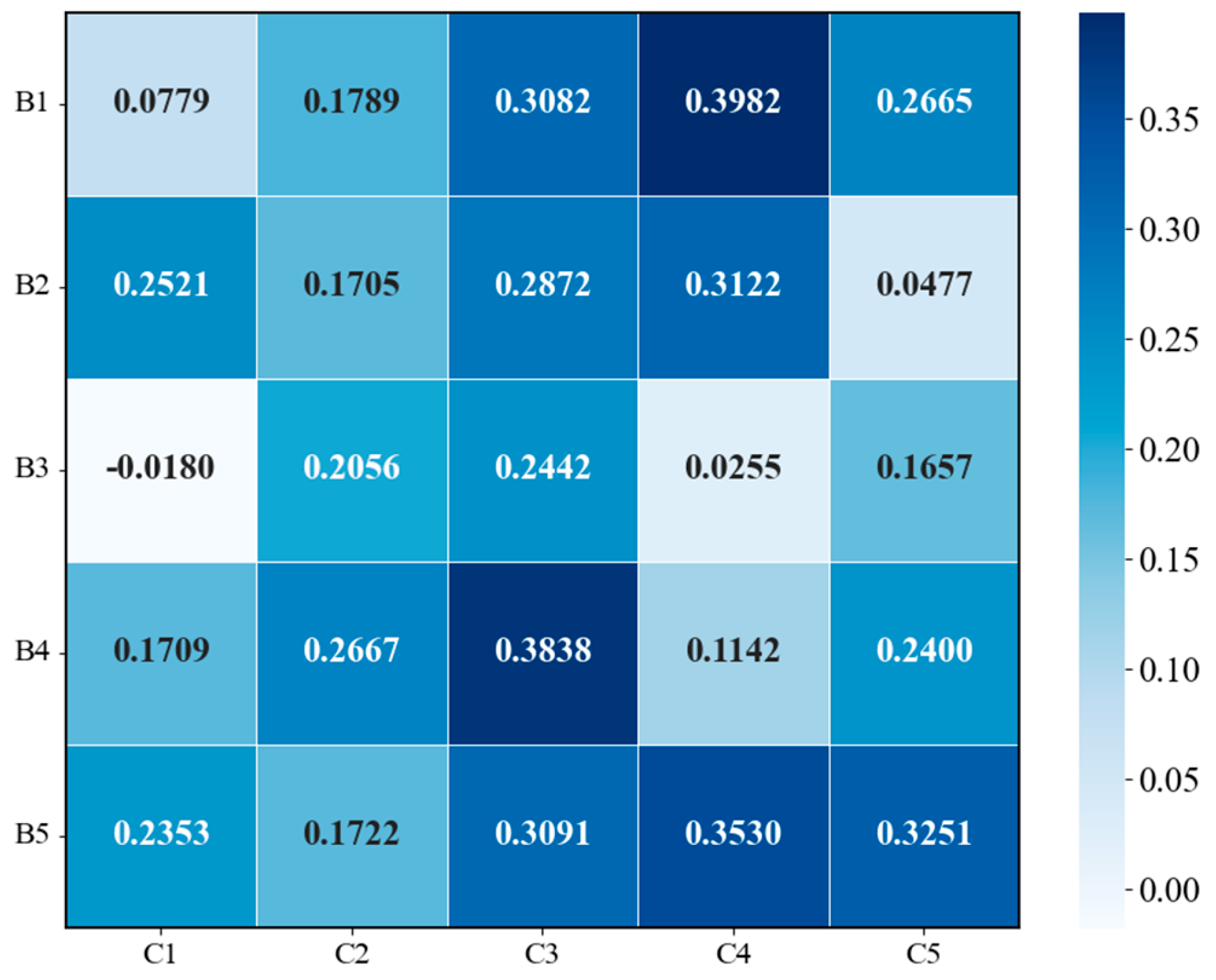 - Calculate the comprehensive influence matrix T by first standardizing the data in B according to Equation (10), and then obtaining the comprehensive influence matrix T based on Equation (11).