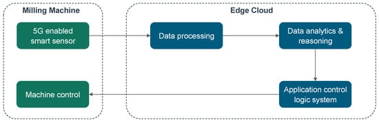 One central benefit of using 5G communication in manufacturing is the ability to seamlessly integrate quality control and assurance functionalities into production processes [30,31]. The use case considered in this section was developed to utilize 5G-TSN (Time-Sensitive Networking) in order to enable an inline quality assurance system for machining based on deterministic real-time communication. The use case was developed in the research project TARGET-X and is described in more technical detail in [20,32]. Test results of the use case have already been published in [10]. Using Frame Replication and Elimination for Reliability (FRER) [33] within the communication pipeline, bounded latency and jitter of the communication with a guaranteed latency of 10 ms for 99.99% of transmitted packets was achieved. The system architecture diagram of the use case is shown in Figure 2.