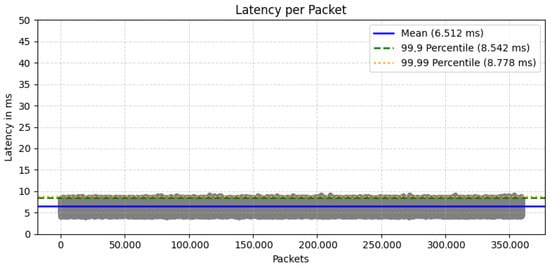 In both equations, UT and LT describe the upper and lower tolerance limit for the latency, while describes the mean and σ the standard deviation of the measured latency. To fulfill the set requirements of the use case, the latency must be within the tolerance specification. Since latency cannot be too low for this use case, only the upper tolerance limit is of relevance here so that a calculation of cpk is sufficient and cp does not have to calculated to prove capability [24]. Figure 4 shows the measured latency per packet for the considered use case. For the measurement, data packets are transmitted from the milling machine to the edge cloud in a redundant way, according to Figure 3, while the timestamps of each individual packet were logged. Based on these logs, latency calculations were conducted for each packet. As indicated by the line visualizing the mean, the average latency value was measured to be 6.512 ms, while the 99.99th percentile was transmitted with a latency of 8.778 ms. Therefore, the technical setup is able to fulfill the latency requirement. This is also proven by the calculation of cpk. With an upper tolerance limit of 10 ms, cpk was calculated to be 1.34, fulfilling the requirement of being greater than 1.33 (see Section 2). Thus, it could be shown that the FRER setup enables stable and controllable data transmission, fulfilling the communication requirements of the use case. Since 99.99% of data have been transmitted within 8.778 ms or less, the requirements regarding the timeliness and completeness of data have also been satisfied, as the required data is transmitted in a sufficient amount, respecting the latency limits.
