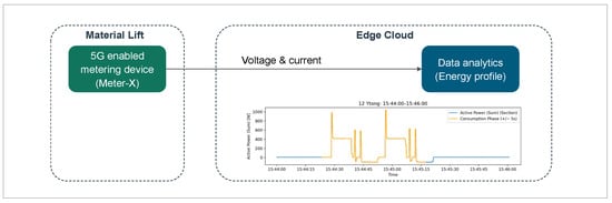 Another core benefit of 5G technology is the potential to establish wireless connectivity in areas that can otherwise not be connected, for instance, expansive and dynamic environments such as construction sites [34]. In these settings, 5G acts as an enabler for the utilization of digital technologies that can improve existing processes [35,36]. To demonstrate the potential of the MAF, an energy-related use case from a construction site is described in this section. The use case is titled “5G for Energy Analytics” and has been described in [20,37]. The use case aims to create energy awareness through the integration of a 5G-enabled metering device (Meter-X) for measuring the power consumption of electrically powered construction machinery like lifts, cranes, or deconstruction robots. The development and application of Meter-X is described in detail in [11]. Usually, the electrical consumption of construction machinery cannot be monitored centrally, as most of the machinery does not offer the functionality to extract and aggregate the data from the machine control. As a result, the environmental footprint of construction sites cannot be calculated precisely, which also contributes to the fact that approaches for reducing the environmental footprint have not yet been broadly implemented in the construction vertical. The 5G for Energy Analytics use case addresses this issue. For its implementation, the metering device is connected to the electricity consumer (material lift) so that the power consumption (voltage and current) can be measured. The metering device is connected to a server through 5G so that the acquired metering data can be logged and analyzed in real time. One key advantage of the Meter-X is the fact that any construction worker can connect it to the construction machinery whose energy consumption is to be measured. No certified electrician is required due to the fact that Meter-X does not require interference with the machine’s internal circuit, as it is a plug-and-play solution that can be connected to any electrical consumer. Based on the measurement of power consumption, the environmental footprint of the use case (User-KVI addressing the societal goal of creating transparency around ecological impacts in Table 2) can be calculated. Following the approach of the MAF, the product of the successful application of the use case is an energy profile for the characterization of energy consumption, which can also be employed to derive optimization approaches in subsequent steps. The system architecture diagram is shown in Figure 5. The measurement values of the voltage and current are sent to the edge cloud from the metering device, which is attached to the material lift. On the edge cloud, the received data is analyzed and visualized so that an energy profile and the calculation of the selected User-KVI are created.