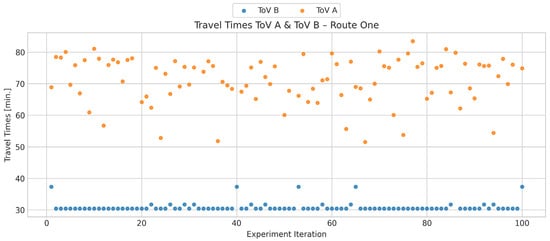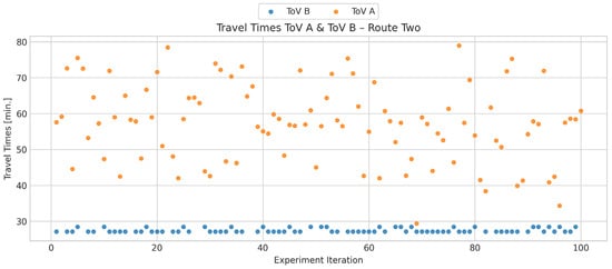 One of the main challenges in tele-operated driving is maintaining reliable network coverage and avoiding potential interruptions caused by QoS degradation, which can result in ToVs becoming immobilized in the middle of the road. The presented use case addresses this issue by establishing a technical solution that enables a capable and stable process that consistently produces the same output (timely arrival of the vehicle) under identical input conditions (fixed route with estimation for the required travel time). For this reason, the User-KPI “Process capability (cp & cpk)” was selected from Table 1. The calculation of cp and cpk allows for the evaluation of whether a stable and capable process can be achieved through the integration of 5G connectivity/features and QoS prediction. To evaluate this aspect, ToV A and ToV B traveled along various routes. The experiment was repeated 100 times with different network conditions, and for each iteration, the travel times of ToV A (without predictive QoS) and ToV B were measured. The results for two different routes (route one and route two) are pictured in Figure 8 and Figure 9 for both vehicles.