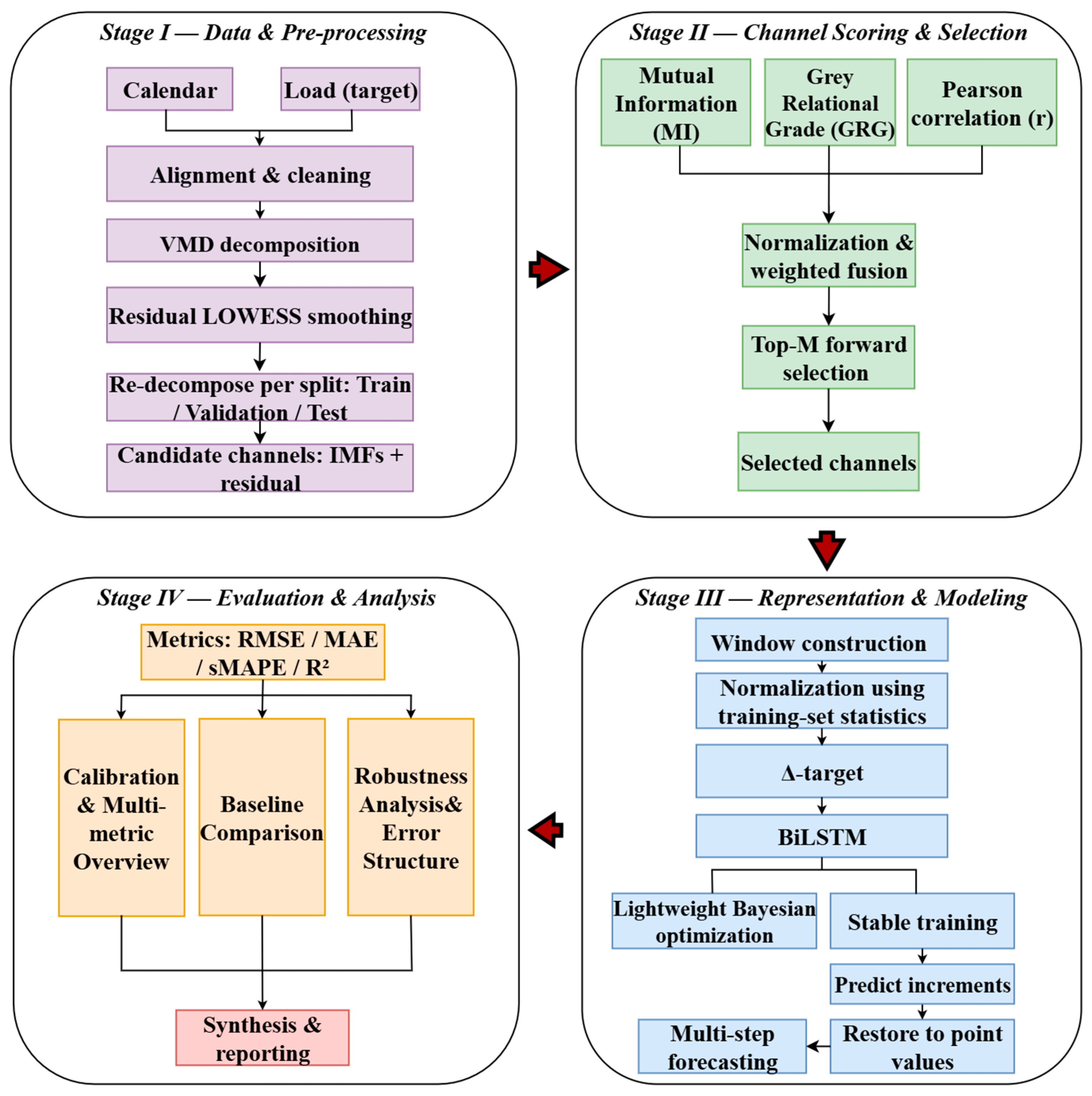 Guo, Y.; Wang, L.; Zhao, J. A Multi-Channel Δ-BiLSTM Framework for Short-Term Bus Load Forecasting Based on VMD and LOWESS. Electronics 2025, 14, 4772. https://doi.org/10.3390/electronics14234772