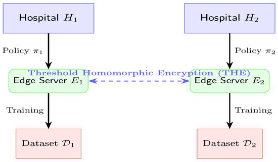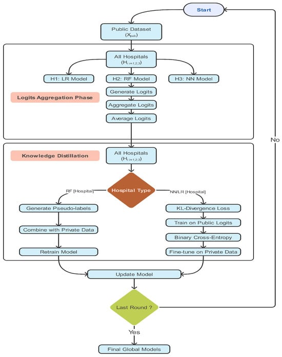 The proposed approach (Figure 3) introduces: (1) dDP for adaptive noise injection, (2) FD for cross-architectural collaboration, and (3) threshold key-sharing with lightweight Quorum verification. This section details: (1) FD-based federated learning, (2) dDP implementation, (3) THE for secure aggregation, and (4) blockchain integrity mechanisms. The system achieves 96.9% accuracy at with 71% lower overhead than conventional approaches.