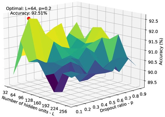 Using the selected Swin transformer model size, a grid search is conducted on the KTH-TIPS2-b dataset (fold 2) to determine the optimal number of hidden units L and dropout ratio p for the classification step of the proposed architecture. The search explores values of L from 32 to 256 in increments of 32, and p from 0.1 to 0.9 in increments of 0.1. The resulting plot is shown in Figure 3, showing that the highest accuracy of 92.51% is achieved with and . Therefore, these values for the classification head are used for all backbones.