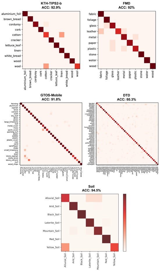 - KTH-TIPS2-b [39], GTOS-Mobile [19], and DTD [42]: As mentioned in Section 4.1, the dataset splits for training, validation, and testing are used as provided by the original sources, with no additional random partitioning or fold generation applied.