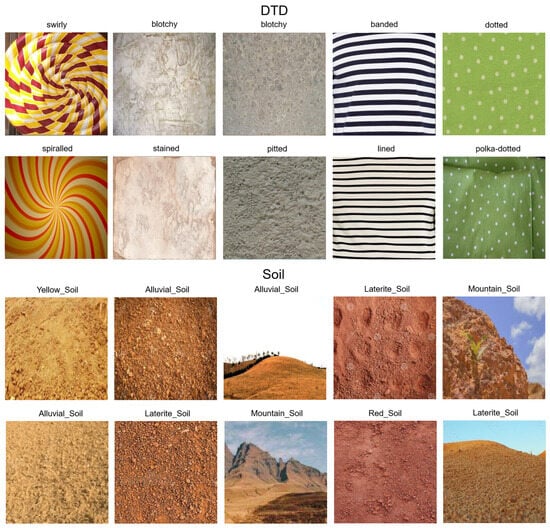 - Cimpoi, M.; Maji, S.; Kokkinos, I.; Mohamed, S.; Vedaldi, A. Describing Textures in the Wild. In Proceedings of the 2014 IEEE Conference on Computer Vision and Pattern Recognition, Columbus, OH, USA, 23–28 June 2014; pp. 3606–3613. [Google Scholar] [CrossRef]