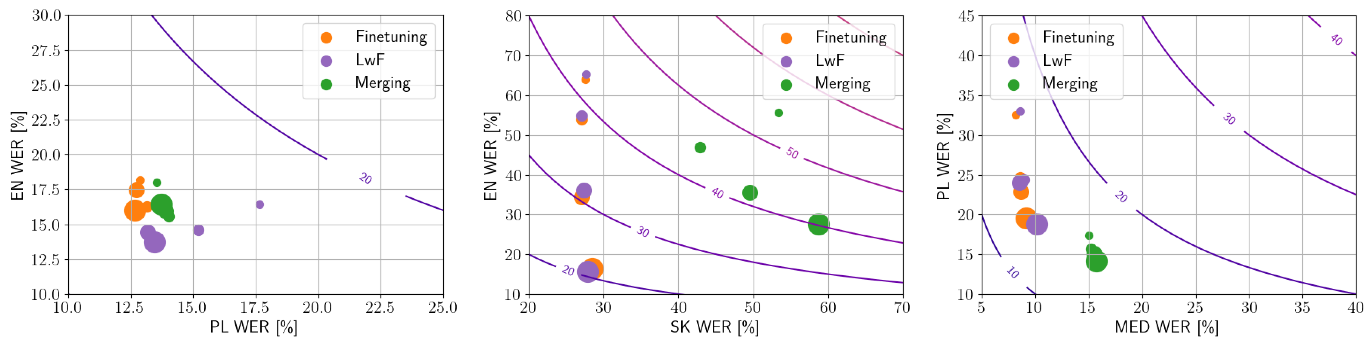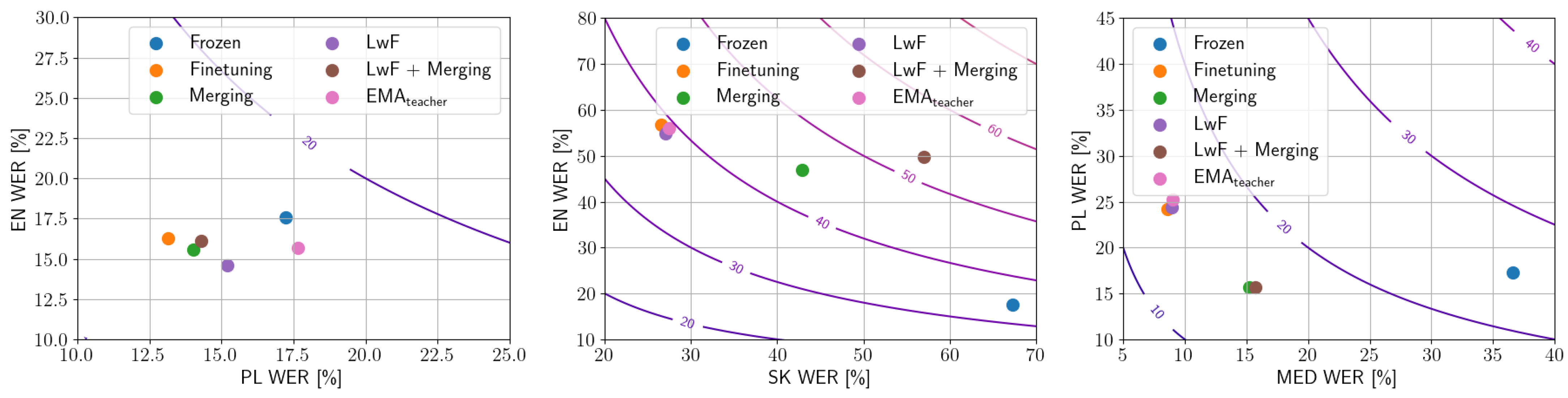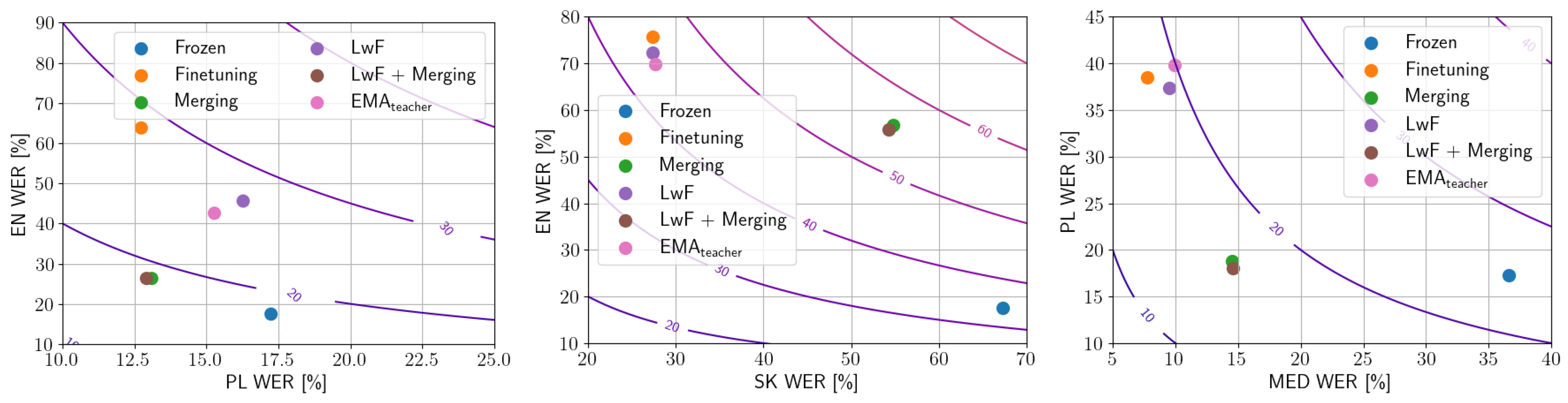 - Learning without forgetting (LwF) [11]—it is a popular Continual Learning method, which was previously successfully applied also in ASR [43,44]. During finetuning it adds a distillation loss to minimize the KL divergence between outputs for the () and the model from the previous task ():We run a parameter search for the optimal value in Section 5.3.