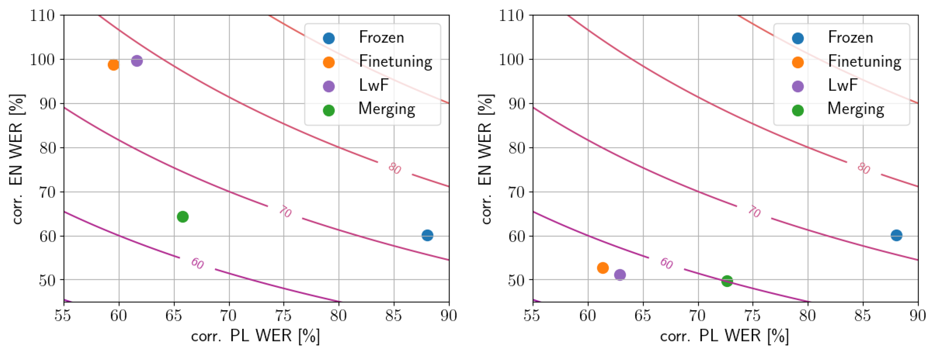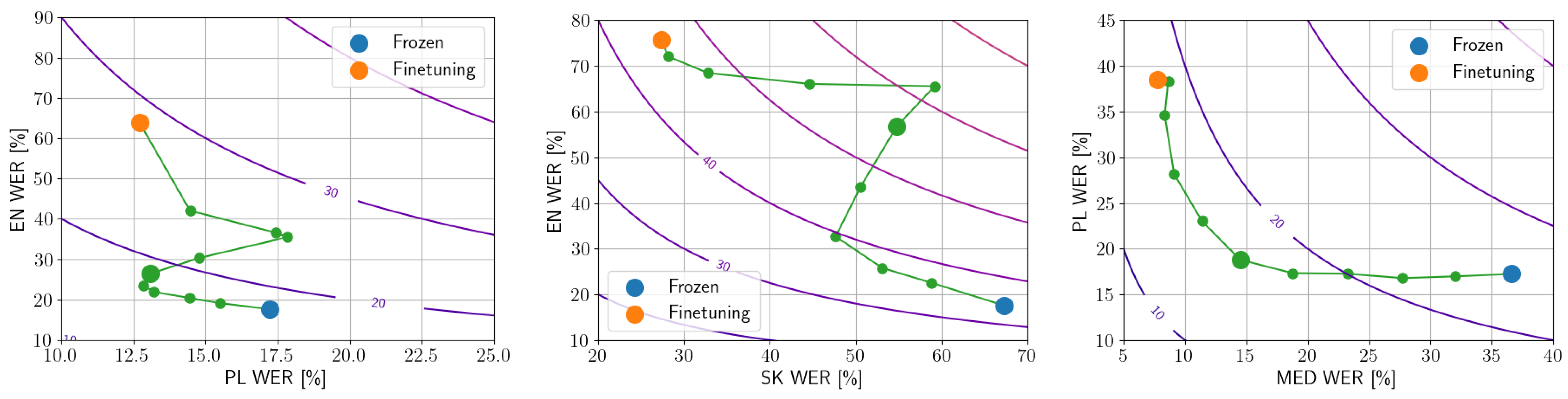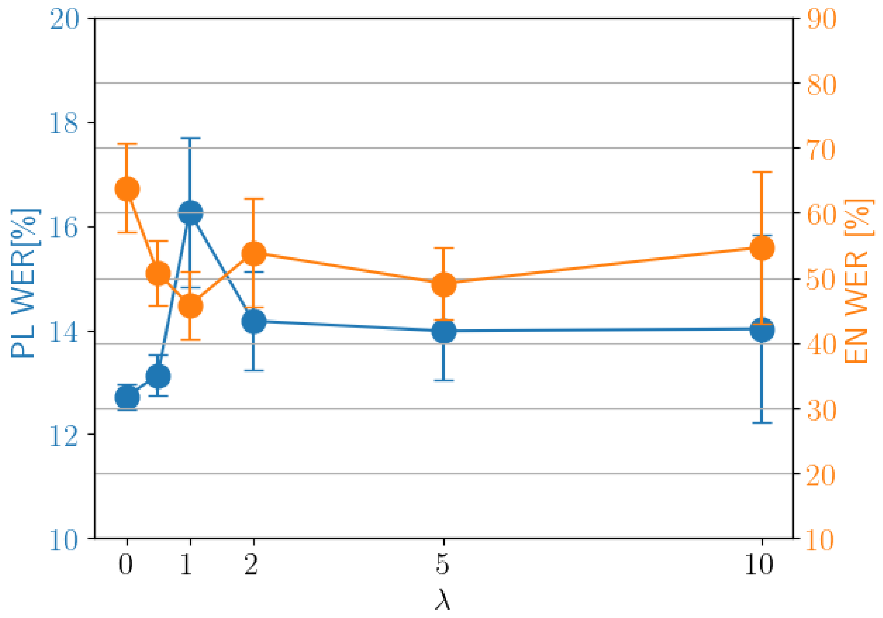 - Similar to the above, but adaptation is performed to the Slovak (SK) language. Here, we are experimenting with a very low-resource language adaptation, with an order of magnitude smaller number of utterances than for the PL language.