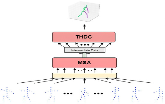 In order for the subsequent THDC network to perform temporal modeling and prediction on 2D keypoints, the MSA layer will simultaneously learn self-attention between keypoints for a sequence of consecutive 2D keypoint frames and produce outputs. In the MSA layer, the largest input unit is a frame of 2D keypoints, and the smallest data unit is a single 2D keypoint vector, which is shown in Figure 3. The maximum input unit is defined as , where J represents the 17 joint points. In 2D space, the set of 2D joint point frames is defined as . In order to amplify the features of joint point vectors and distinguish general characteristics, each keypoint vector is linearly embedded into a high-dimensional space. Meanwhile, considering the gradient vanishing problem during backpropagation in the embedding layer, inspired by ResNet [23], the joint point vectors are skip-connected to the output of the embedding layer. Let D be the dimension after mapping, then the linear mapping matrix is , the skip-connection matrix is , and the processed output matrix is . The entire process can be expressed by Formula (3).