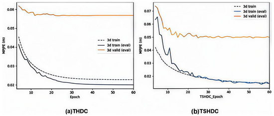 Under identical conditions including epoch number, learning rate, decay factors, and related structures for both THDC and TSHDC models, experiments were conducted to compare model convergence speed, accuracy, and generalization performance. In order to better reflect the performance of the model, the loss function will be calculated separately for the three objects [25]. Here, 3d_train represents MPJPE on the partitioned training set without updating parameters, 3d_train(eval) represents MPJPE on the non-partitioned training set after updating the parameters, and 3d_valid(eval) represents MPJPE calculated on the test set (S9, S11) after updating the parameters.