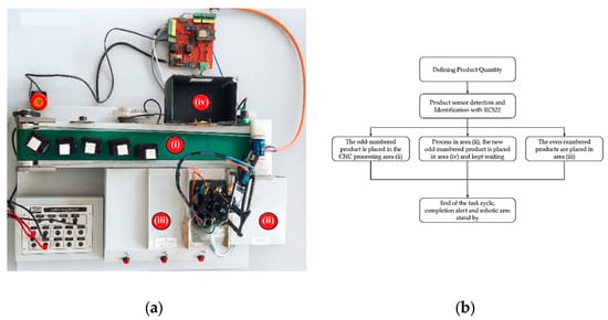 In the Automatic mode scenario, after selecting “Automatic Mode” on the system configuration page, the operator entered and confirmed the target number of products to be processed and sorted as 5. The robot waits in the starting position. After the number of products is confirmed, the conveyor begins moving. The product is detected as it passes in front of the retroreflective sensor and reaches the RFID reader location, the conveyor stops, and the product tag is identified. Real-time data can be monitored as the product moves on the conveyor, as shown in Figure 9b. A scenario was planned and run as a demo where the product tag numbers were 1, 2, 3, 4, and 5, respectively. In the planned scenario, the product with the odd-numbered ID number is placed directly into the CNC processing area (ii). The product with the even-numbered RFID tag number is transferred to area (iii). The label for product number 1 was detected on the conveyor and taken from area (i) by the robotic arm to the CNC processing area (ii). When the label for product number 2 was read and detected by the robotic arm, it was transferred to area (iii) because its label was an even number. When product number 3 reached the robotic arm, it was placed in area (iv), and it was observed that product number 1 was waiting for the CNC processing to be completed. The program cycle ended by repeating the same process for products number 4 and 5. When the cycle ended, meaning that the transfer of five products from the conveyor to the relevant areas by the robotic arm, the system emitted an audible warning and a visual alert with a status LED. The robotic arm returned to its safe standby position. The emergency demo test of the system was performed in automatic mode as follows: The system was restarted for the same scenario and five products. While product number 1 was being transferred to the CNC area by the robotic arm, the emergency button for area (ii) was pressed. It was observed that the system stopped completely during the emergency stop, and the emergency buzzer operated.