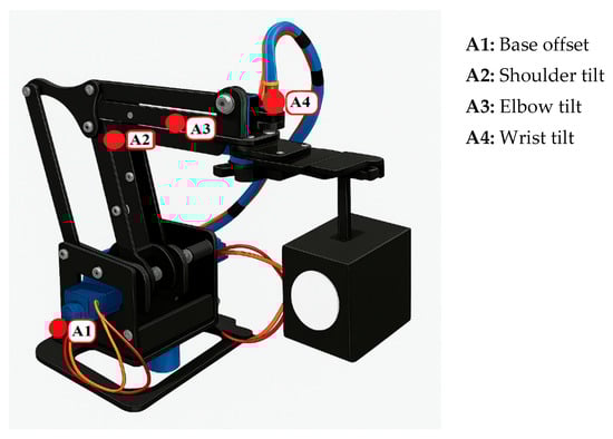 The robotic arm is constructed from laser-cut acrylic Polymethyl Methacrylate (PMMA) mounting plates with aluminum mounting brackets on a rigid base aligned with the conveyor axis. The robot arm uses SG90 servo motors, which can be controlled via a PWM signal and rotate through 180 degrees. The robot arm also uses limit switches to send event notifications to the ESP32, and an MPU6050 gyroscope and acceleration sensor are located on the top of the robot. The MPU6050 gyroscope and acceleration sensor, communicating via I2C, are used to control servo drift and obtain the robot’s current rotation angles. These sensors are integrated into the system to monitor servo error conditions. As shown in Figure 4, it consists of four joints: base offset (A1), shoulder tilt (A2), elbow tilt (A3), and wrist tilt (A4). A parallel-jaw gripper with compliant pads can grip box-shaped objects. The grip width is set during setup and applied with a short dwell stroke in automatic cycles. Each axis is protected by mechanical hard stops and limit switches, which also allow for return to standby position. The cables are secured with loose loops at their connection points, preventing any possible restrictions on the robotic arm’s movement. Electromagnetic interference is reduced by physically isolating the high-current servo wiring from the RFID reader by following the connection centerlines [37].