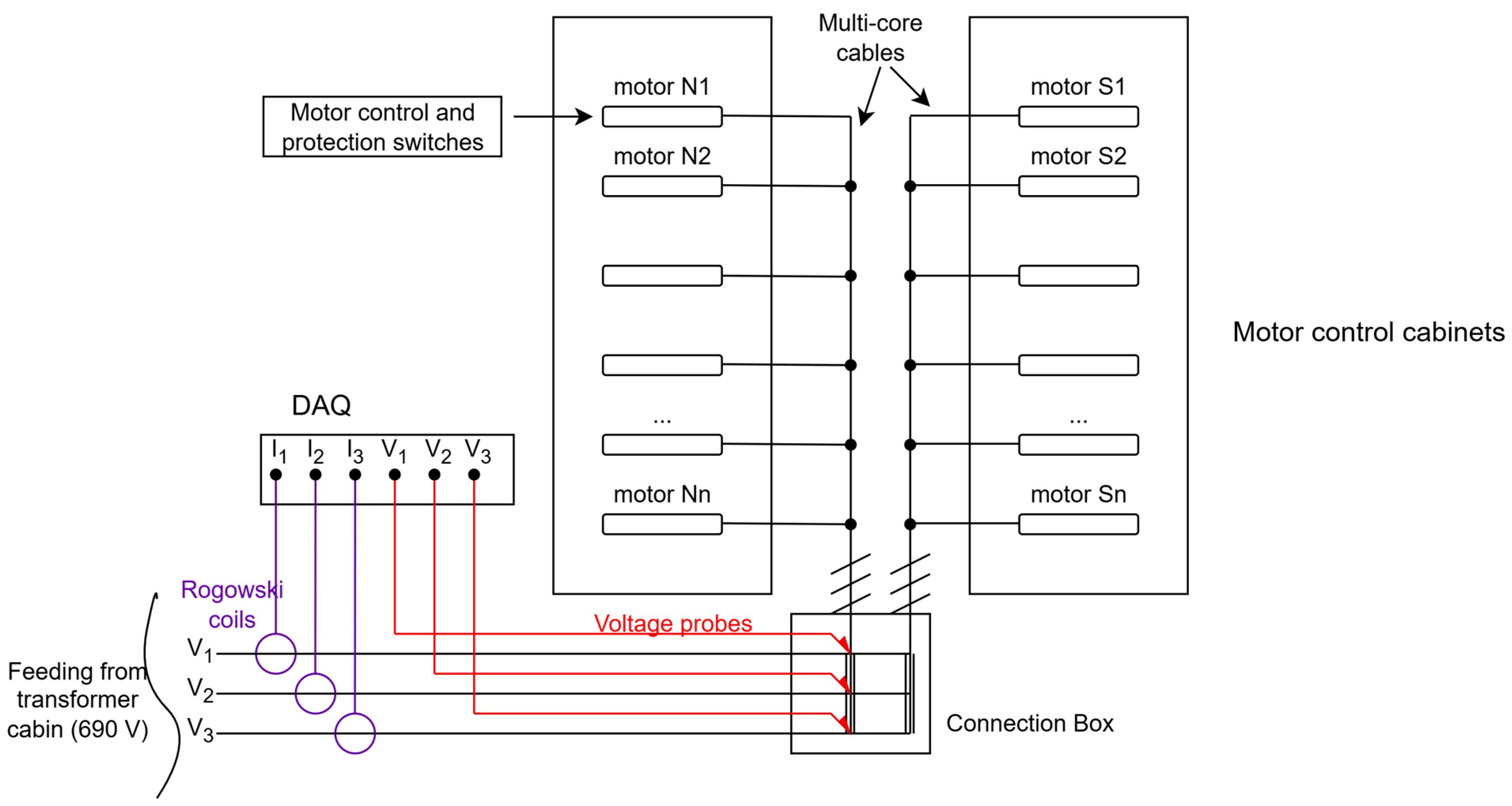 Since the motors are most of the time non-energized, and since the electrical system had a configuration with a three-phase line dedicated only to the motors feeding (no other auxiliary connected to the line), this setup required the installation of only one DAQ and computer to monitor all the motors of the tunnel. In fact, the motors can be energized one at a time, storing the data in the computer. This operation is usually carried out by maintenance staff at least once a month, to assure that the motors do not stay off for too long (if air-quality and emergency are not triggered, motors stay off), giving them moisture and bearing issues. Thus, it was sufficient to energize only one motor at a time during the scheduled maintenance operations, instead of energizing many motors at a time. In this way, the measurement of the motors signals was possible (even without maintenance staff the operation can be carried out remotely).