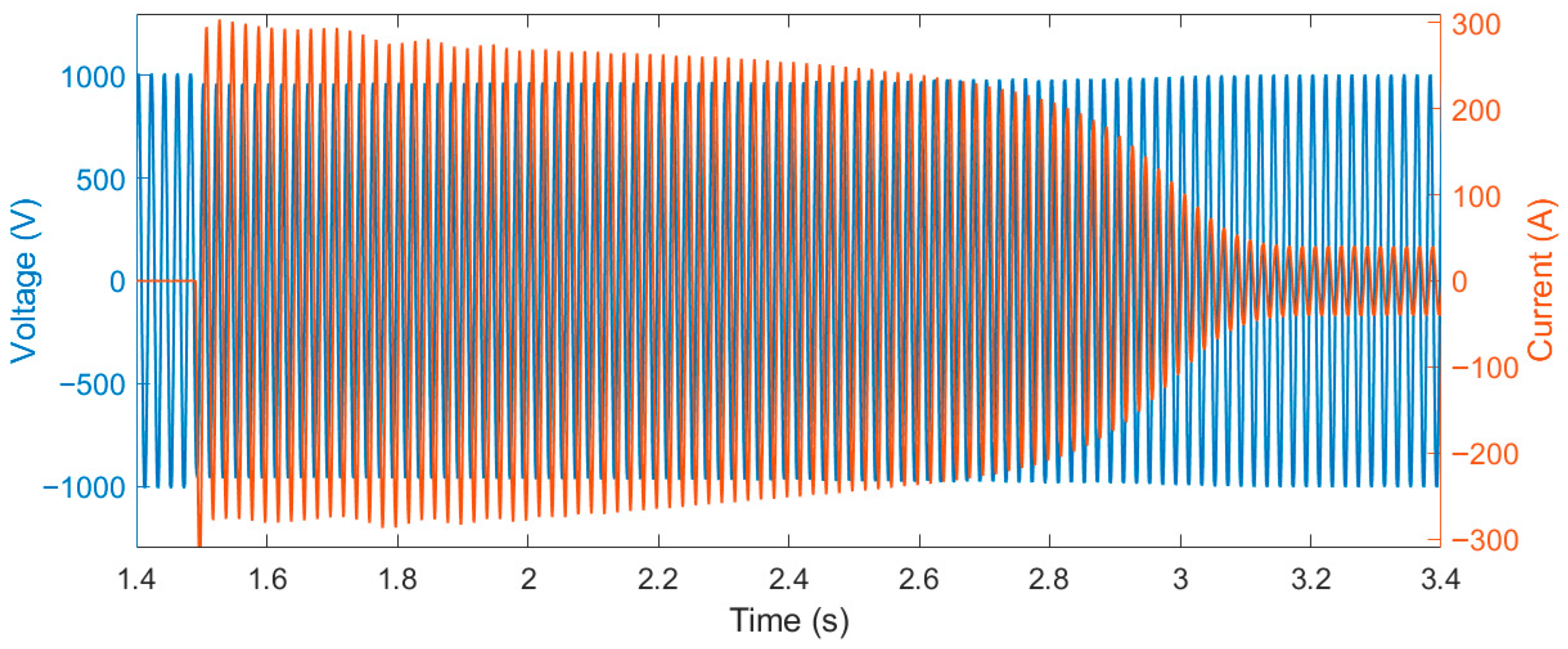 33]. An accounted issue in Rogowski coils is that their accuracy can slightly change with their relative location with respect to the cable on which the current is measured. However, since the installation is fixed—at least in a test campaign—this should not represent a very detrimental condition. Also, the reduction in the SNR, given using the 300 A scale, is considered not critical for the detection of the faults considered in this paper.