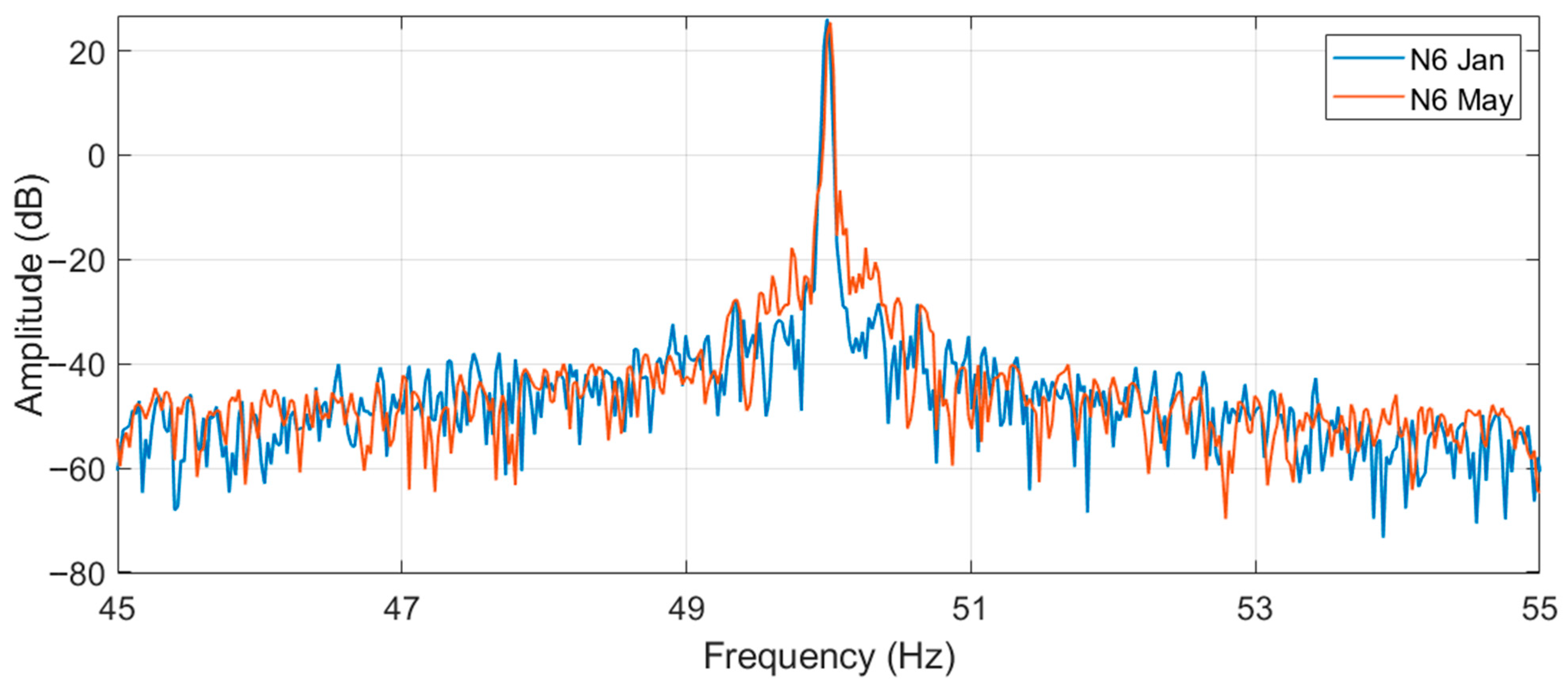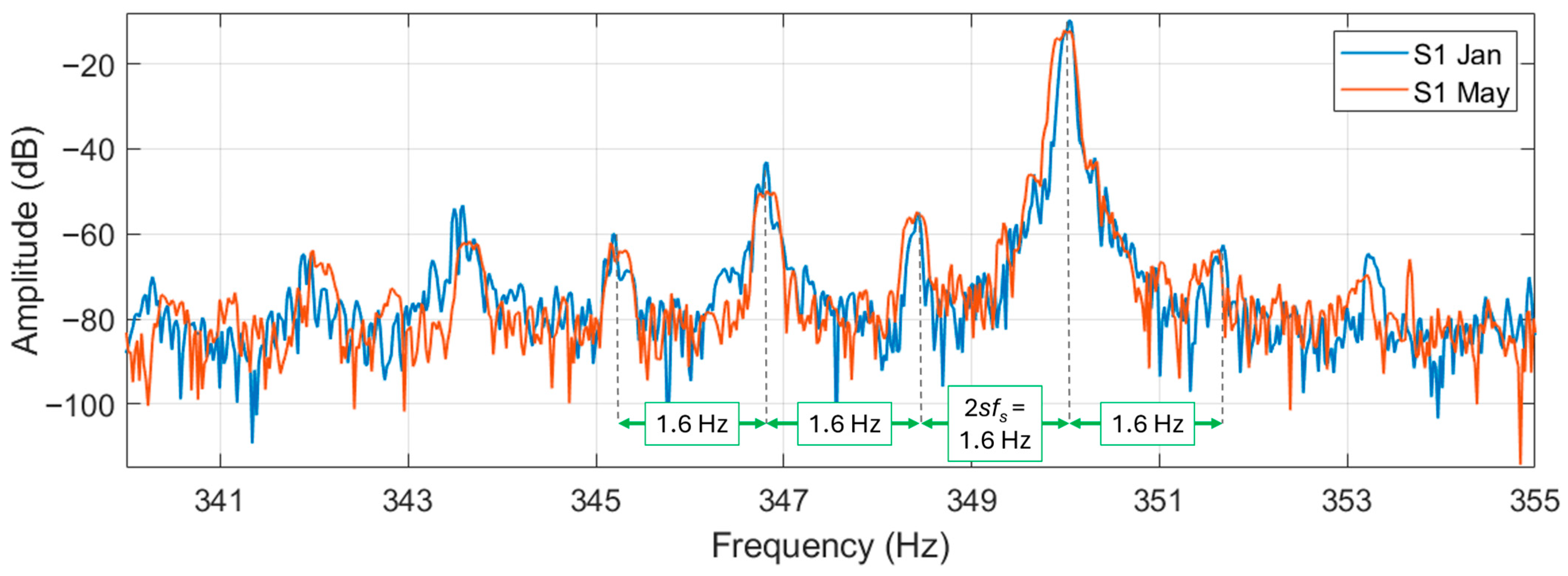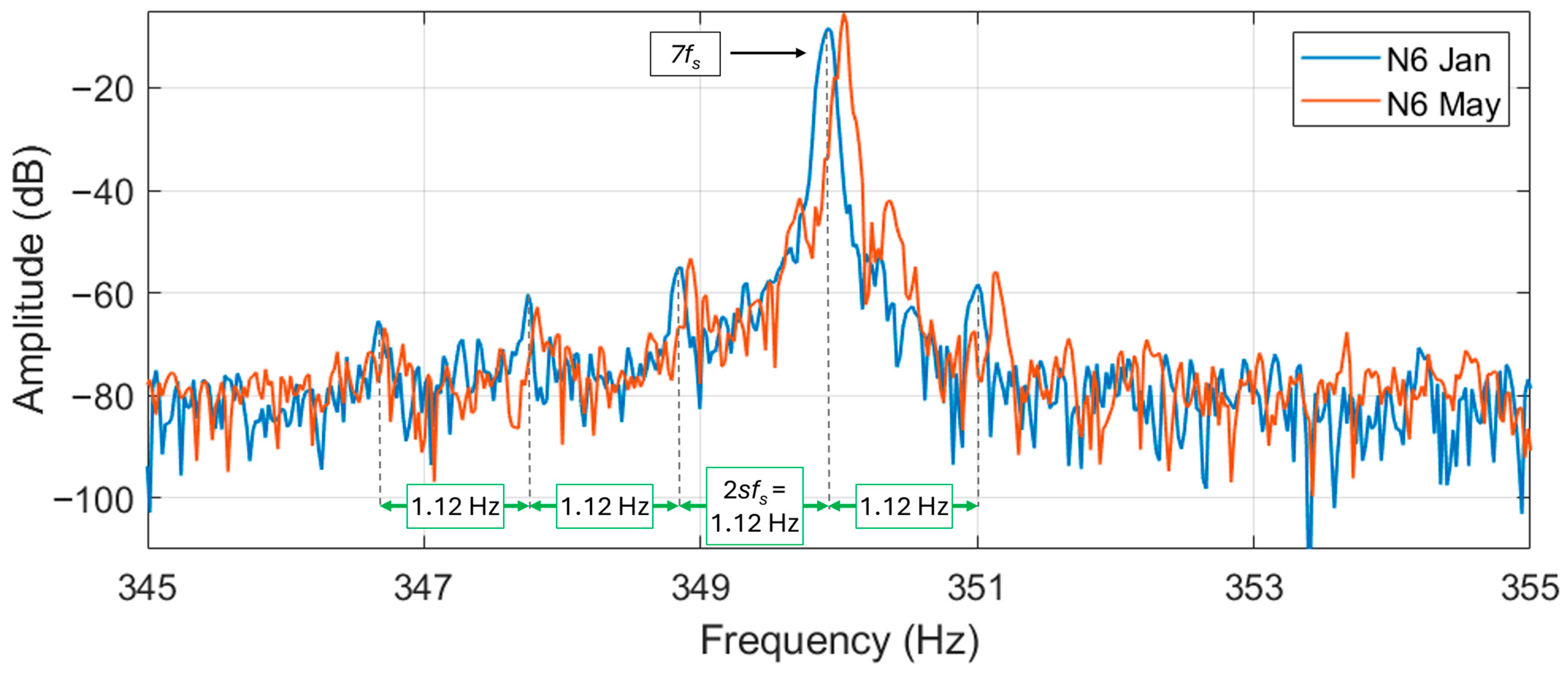 A difference can be noticed between the two motors in this frequency range: in motor N6 it is practically not possible to see any sidebands (from Formula (1)) around the supply harmonic. In motor S1, instead, the sidebands are noticeable at about 1.6 Hz (especially for the signal acquired in May). In motor S1, the magnitude difference between the fundamental and the sidebands is about 55 dB. The difference in energy between these sidebands and the fundamental, that does not change in the period between January and May, implies the absence of the broken bar fault. However, since those harmonics are clearly visible, it can be hypothesized that an amount of porosity in the aluminum cast (or other kind of inherent rotor circuit or magnetic asymmetries) is present in S1 to generate the sidebands. The porosity in the aluminum diecast is a manufacturing defect that in the authors’ opinion will not deteriorate significantly over time (unless it is very severe). So, the motor can continue working. However, higher rotor losses (due to a higher rotor electrical resistance) and a torque oscillation in the motor output (due to a non-uniform distribution of the electrical resistance in the rotor bars) can be expected. These side-effects can potentially increase the motor temperature (accelerating the deterioration of winding insulation) and induce bearing wear due to the speed oscillation deriving from the torque oscillation. So, though it is difficult to effectively verify the porosity, it is worth giving attention to bearings and insulation health during the maintenance inspections.