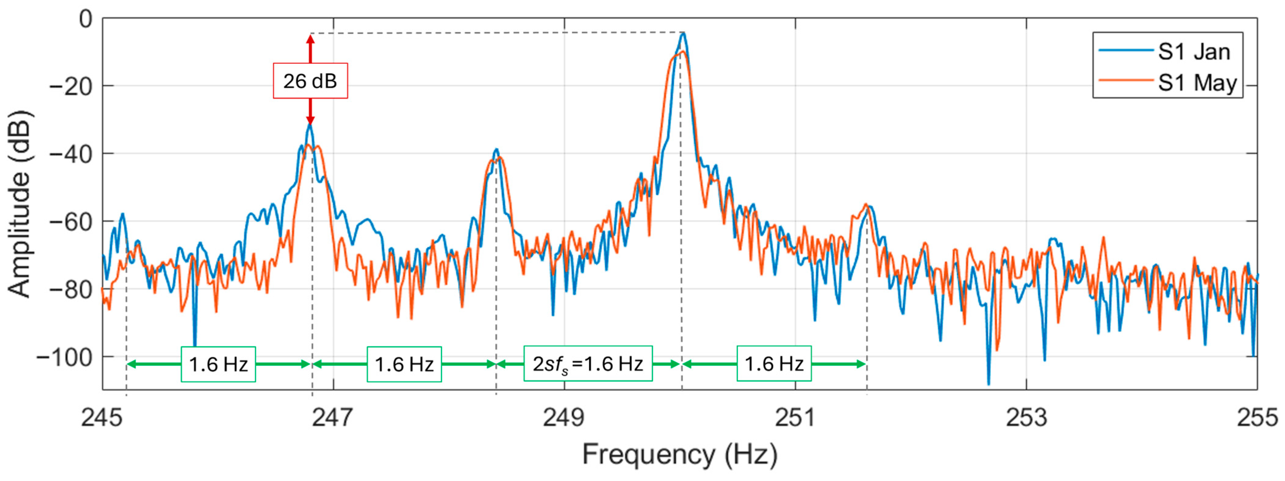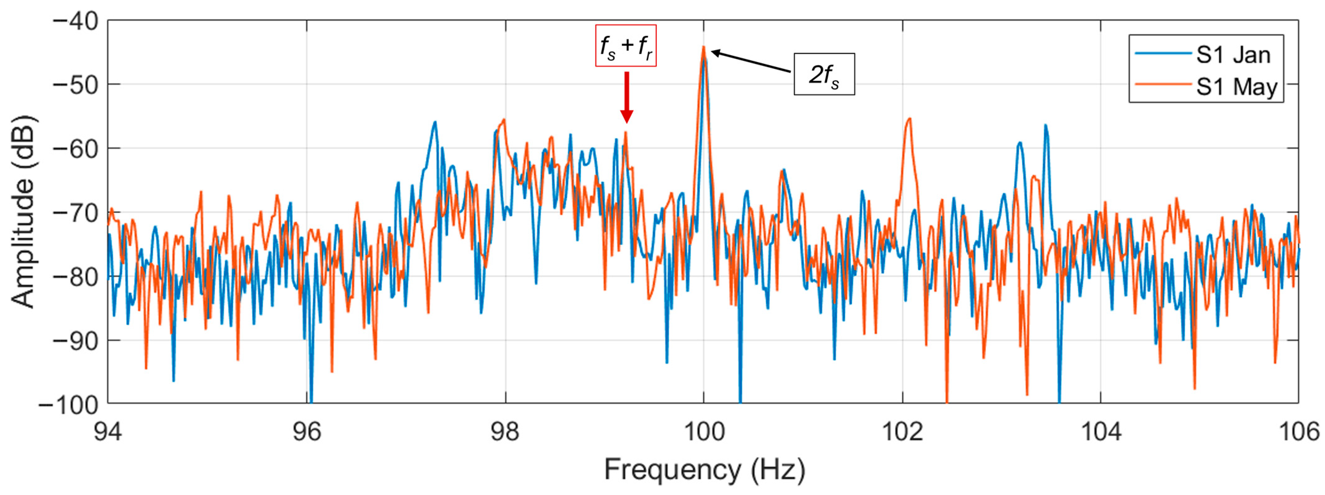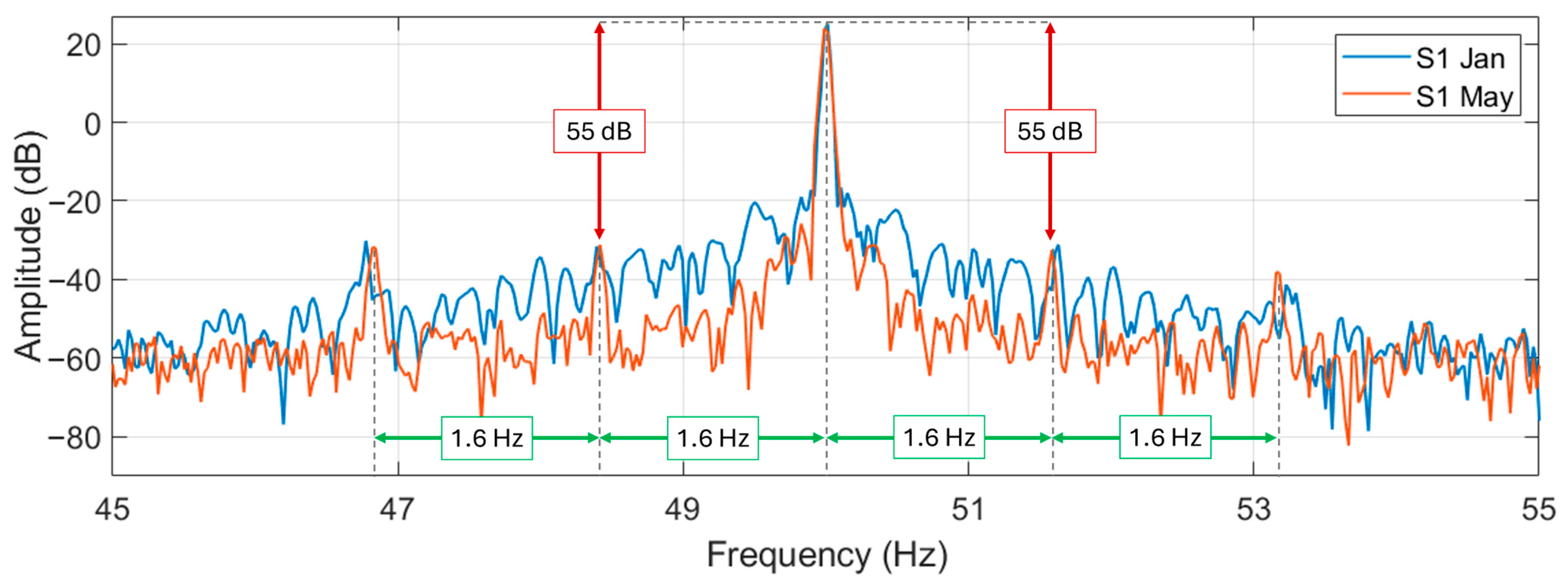 A difference can be noticed between the two motors in this frequency range: in motor N6 it is practically not possible to see any sidebands (from Formula (1)) around the supply harmonic. In motor S1, instead, the sidebands are noticeable at about 1.6 Hz (especially for the signal acquired in May). In motor S1, the magnitude difference between the fundamental and the sidebands is about 55 dB. The difference in energy between these sidebands and the fundamental, that does not change in the period between January and May, implies the absence of the broken bar fault. However, since those harmonics are clearly visible, it can be hypothesized that an amount of porosity in the aluminum cast (or other kind of inherent rotor circuit or magnetic asymmetries) is present in S1 to generate the sidebands. The porosity in the aluminum diecast is a manufacturing defect that in the authors’ opinion will not deteriorate significantly over time (unless it is very severe). So, the motor can continue working. However, higher rotor losses (due to a higher rotor electrical resistance) and a torque oscillation in the motor output (due to a non-uniform distribution of the electrical resistance in the rotor bars) can be expected. These side-effects can potentially increase the motor temperature (accelerating the deterioration of winding insulation) and induce bearing wear due to the speed oscillation deriving from the torque oscillation. So, though it is difficult to effectively verify the porosity, it is worth giving attention to bearings and insulation health during the maintenance inspections.