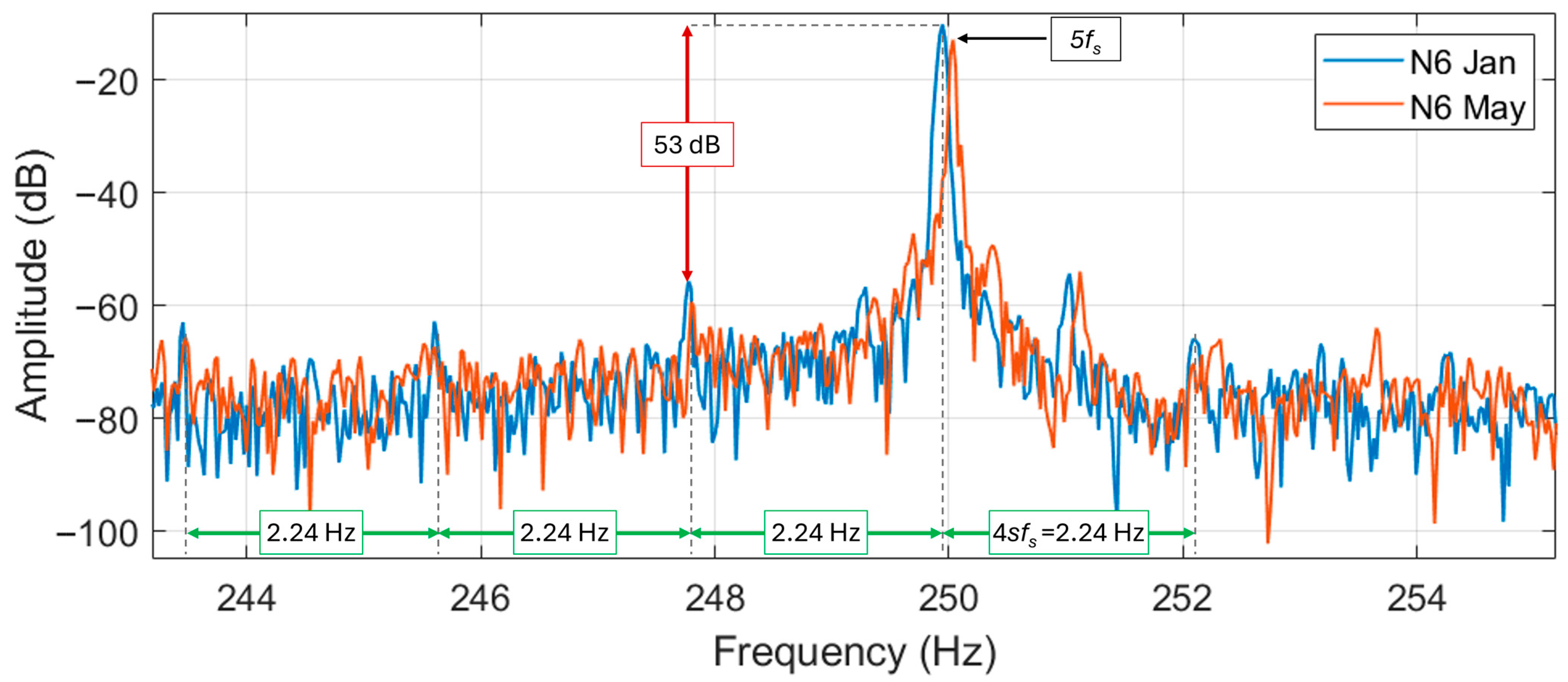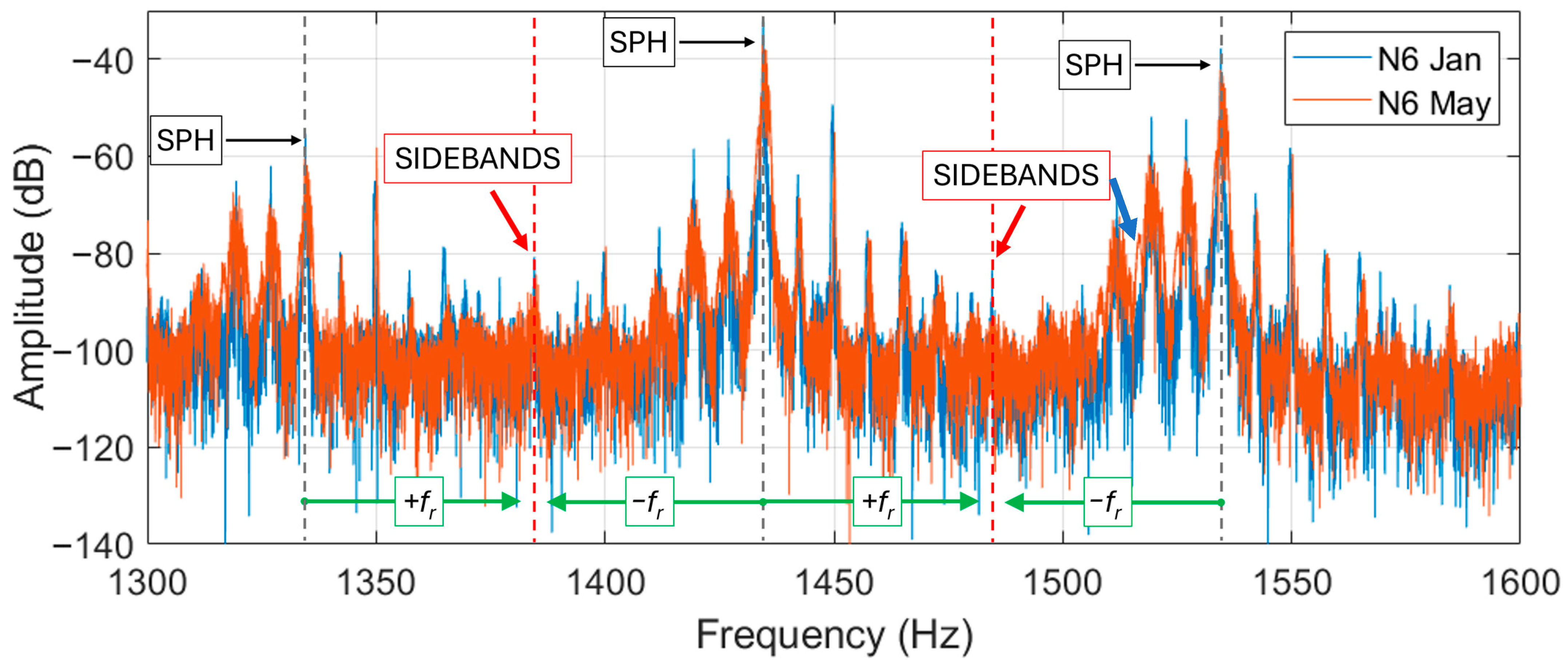 In motor N6 the SPHs with higher energy are placed at about 1434 and 1534 Hz. In this case, the measured amplitude is particularly high for the measurement carried out in January. The research of the