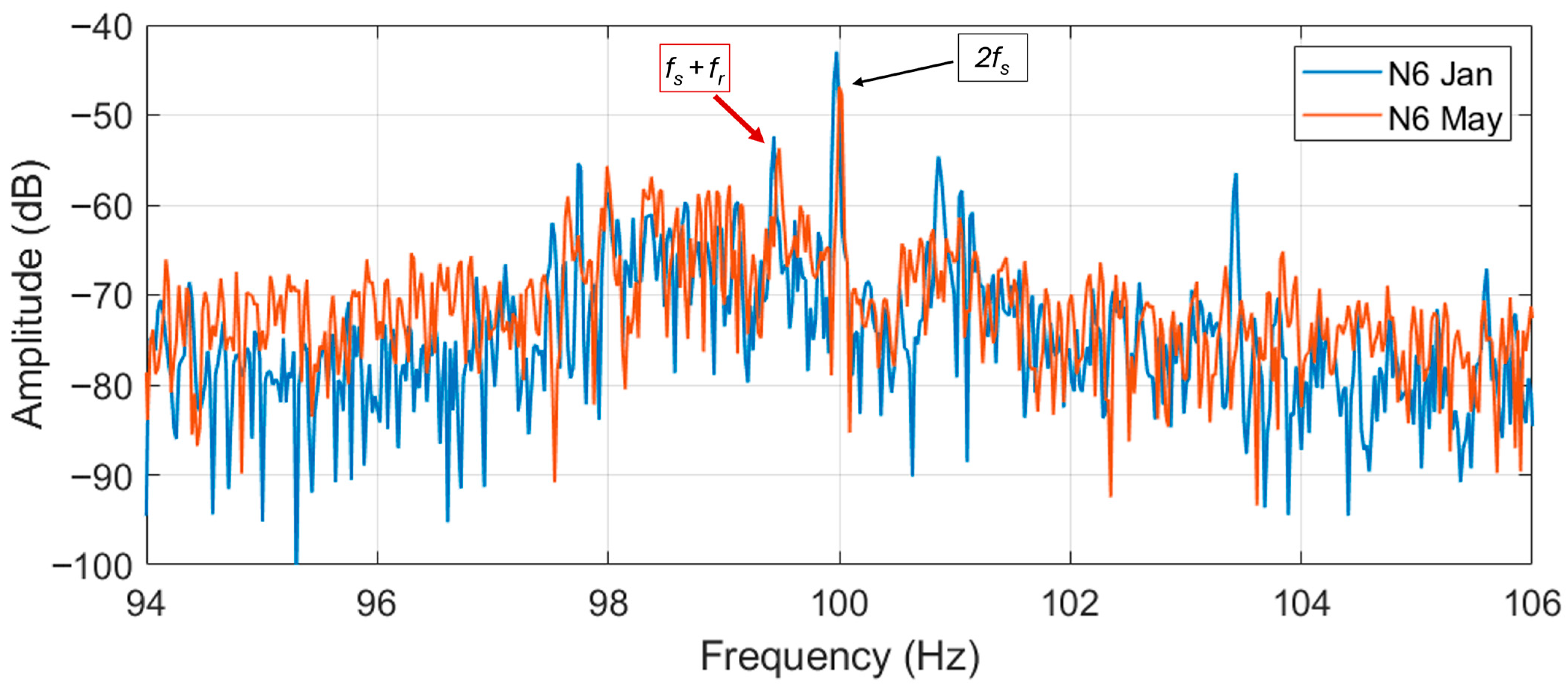 As regards the magnitudes of these harmonics, to the knowledge of the authors, no fixed threshold limit is defined in the literature that indicates severe faults. However, in this work, the harmonic magnitude is monitored in time and compared to . The eccentricity harmonics are found to be lower than the 100 Hz harmonic of about 10 dB and 13 dB for motor N6 and S1, respectively. In authors’ opinion this should not represent a critical level of eccentricity.