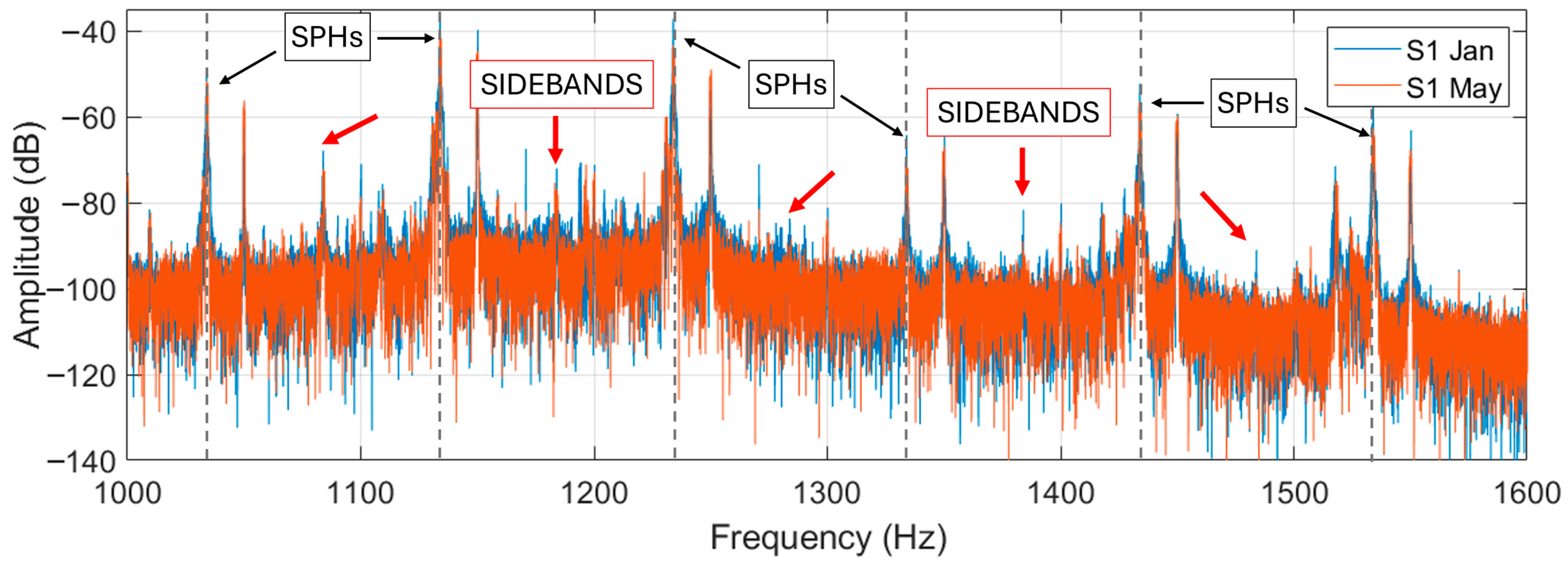 Regarding motor S1, similar results are found. In this case the highest SPH is at 1134 Hz approximately instead of the one at 1434 Hz found in the motor N6. This is probably due to a different number of rotor bars but can also be hypothesized as a filtering effect on the acquisitions, e.g., due to different cable lengths in the two motors. The spectra of motor S1 are depicted in