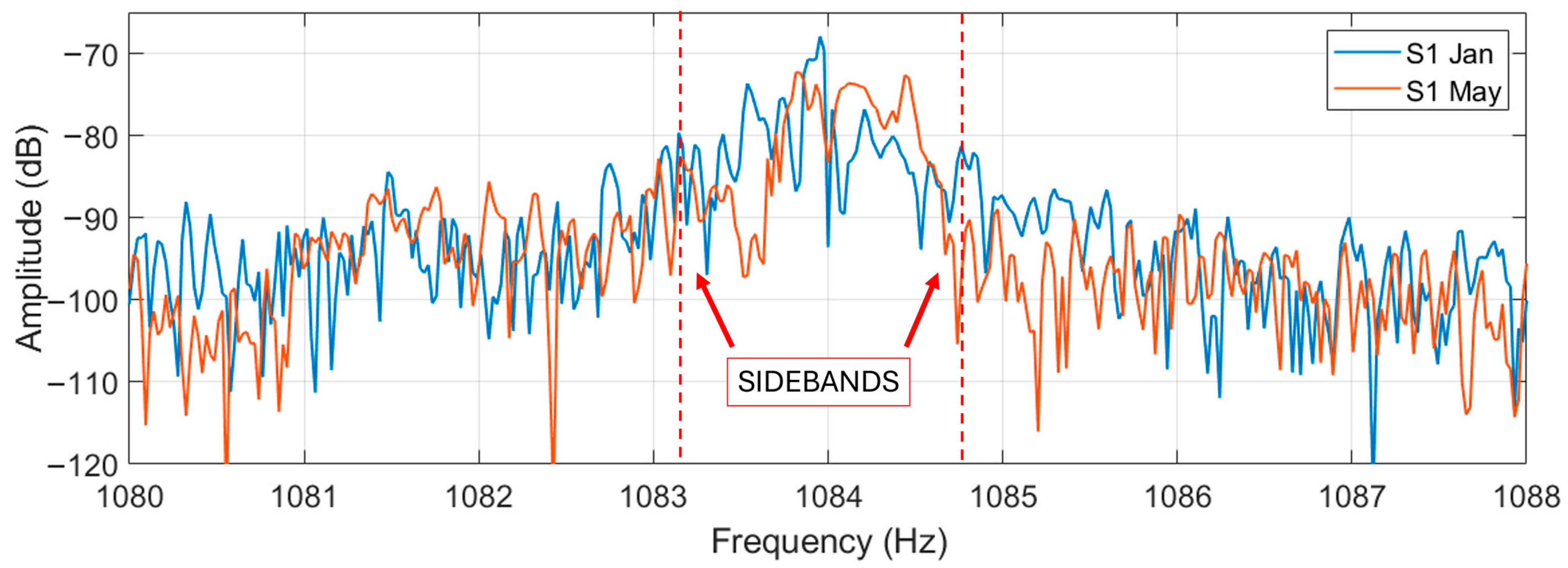 The highest sidebands harmonics have been found between the SPHs at 1034 and 1134 Hz. Zooming these sidebands (