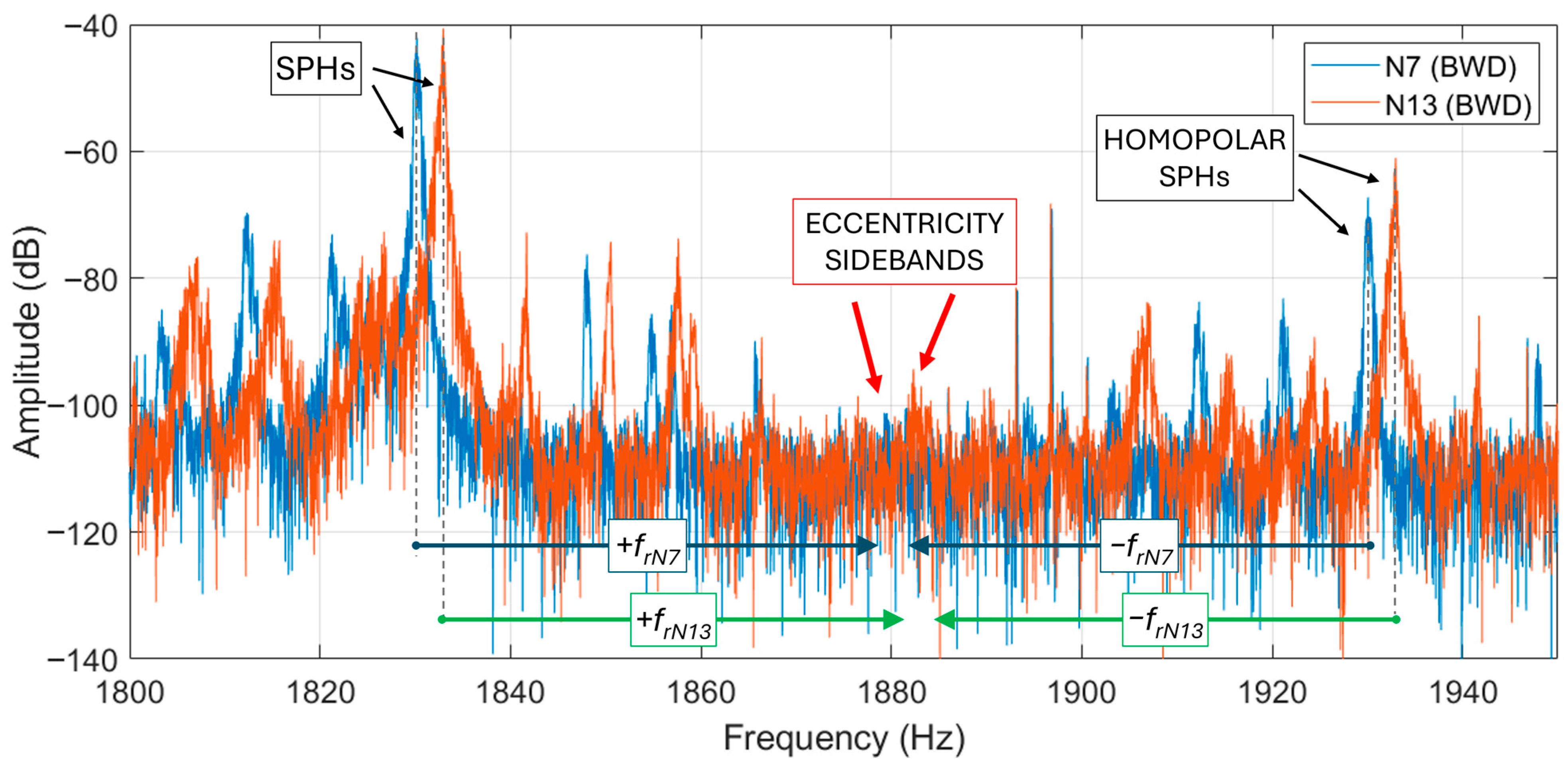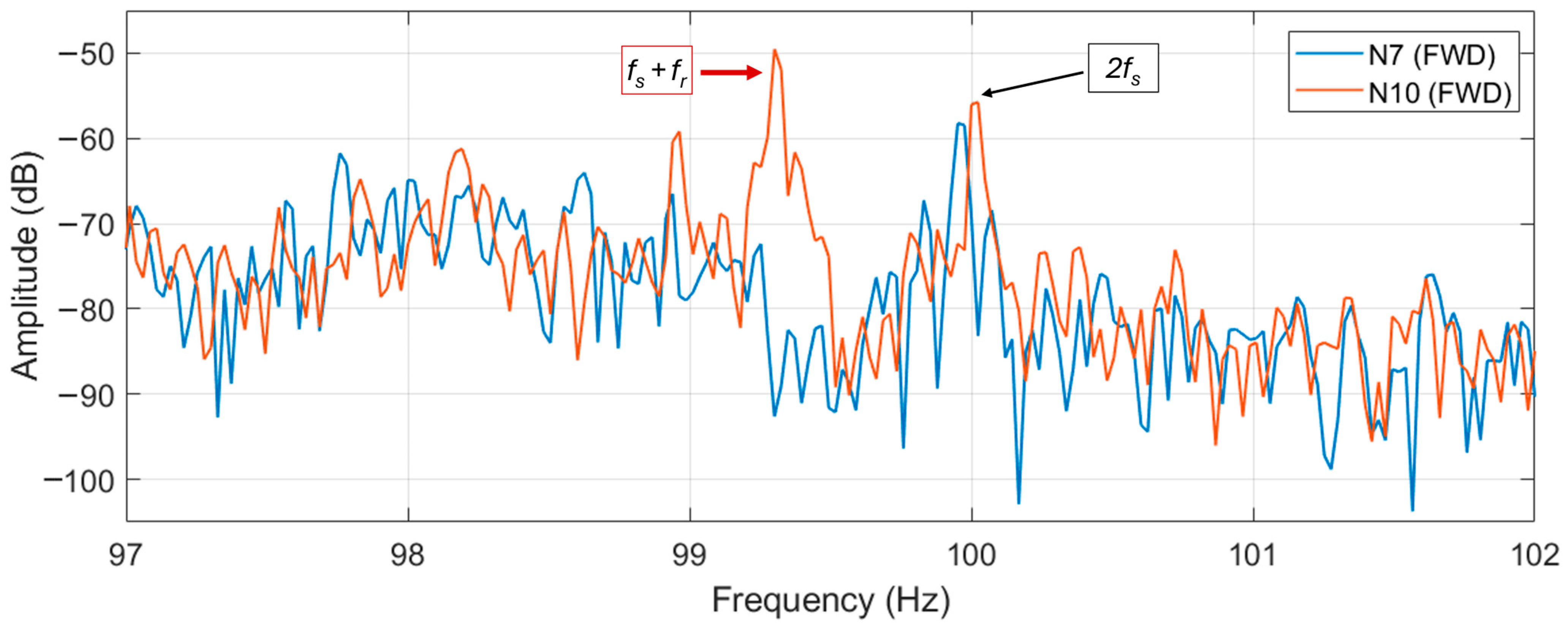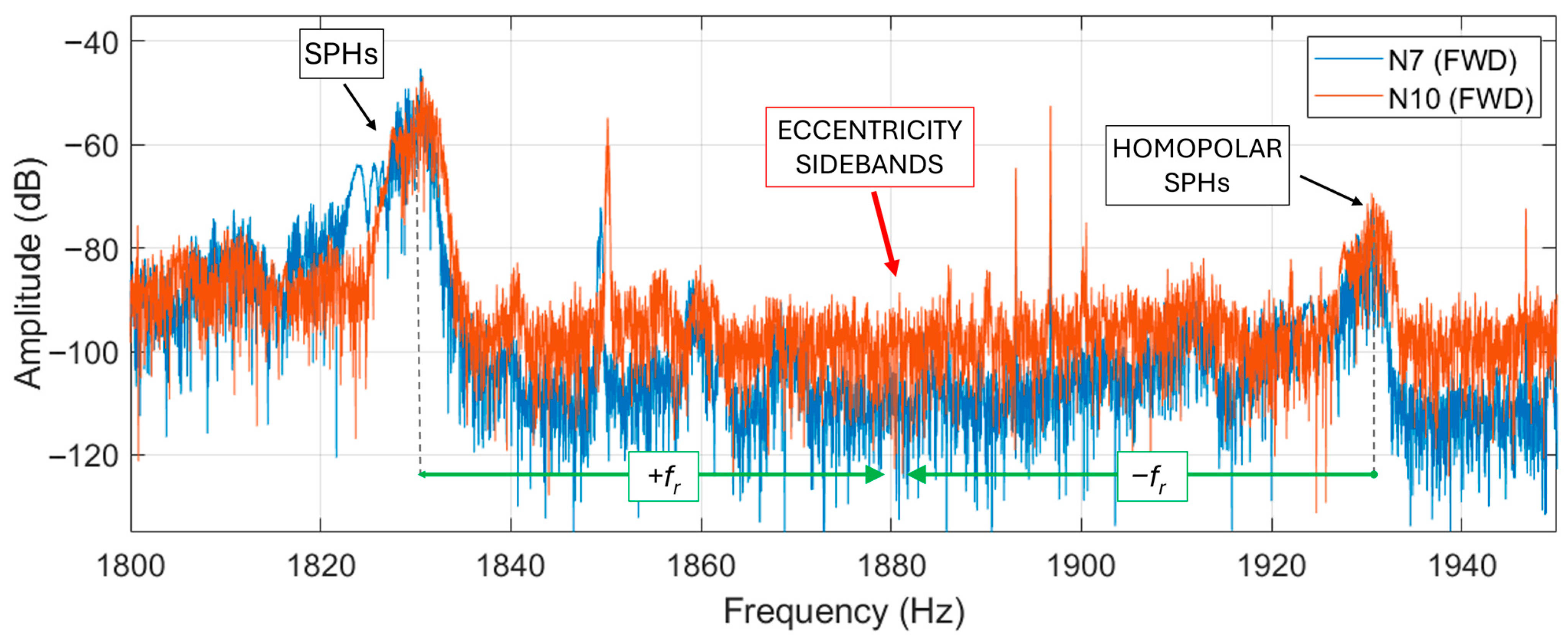 Figure 18. In the figure the second supply harmonic is visible at 100 Hz, whose amplitude is similar for both motors. However, the eccentricity harmonic is much higher in N10 than N7 motor (about 20 dB more), being even higher in amplitude than the 100 Hz harmonic of about 6 dB. In the authors’ opinion this comparative analysis, between two similar motors (if not equal), can highlight eccentricity problems in motor N10.