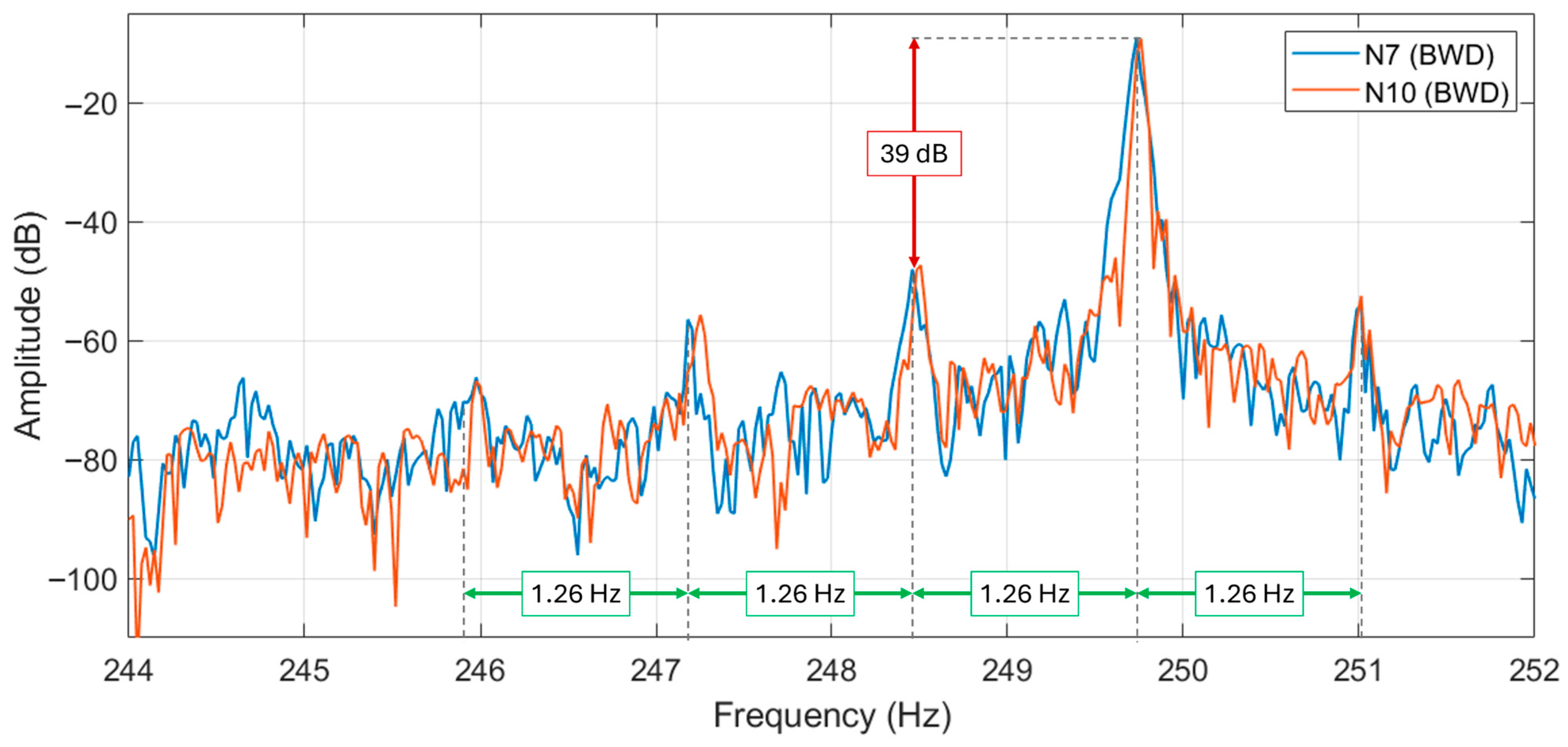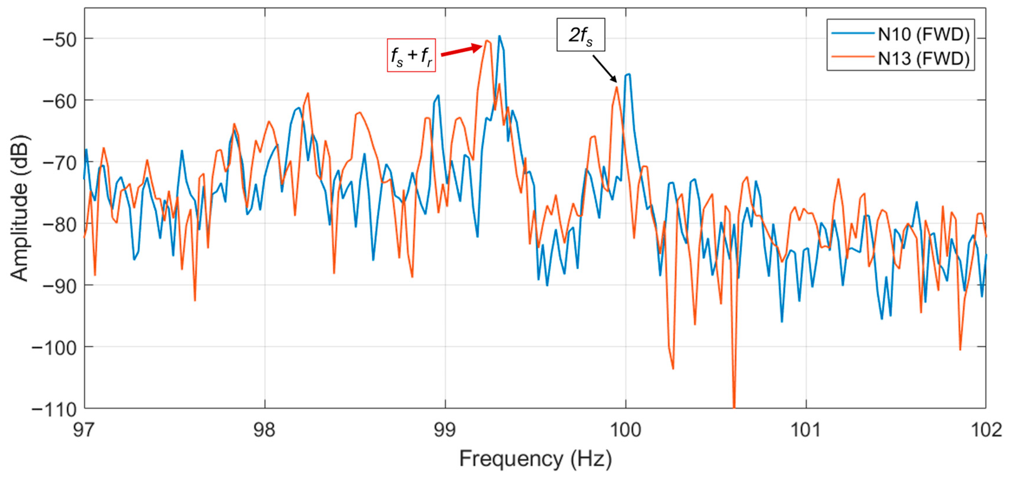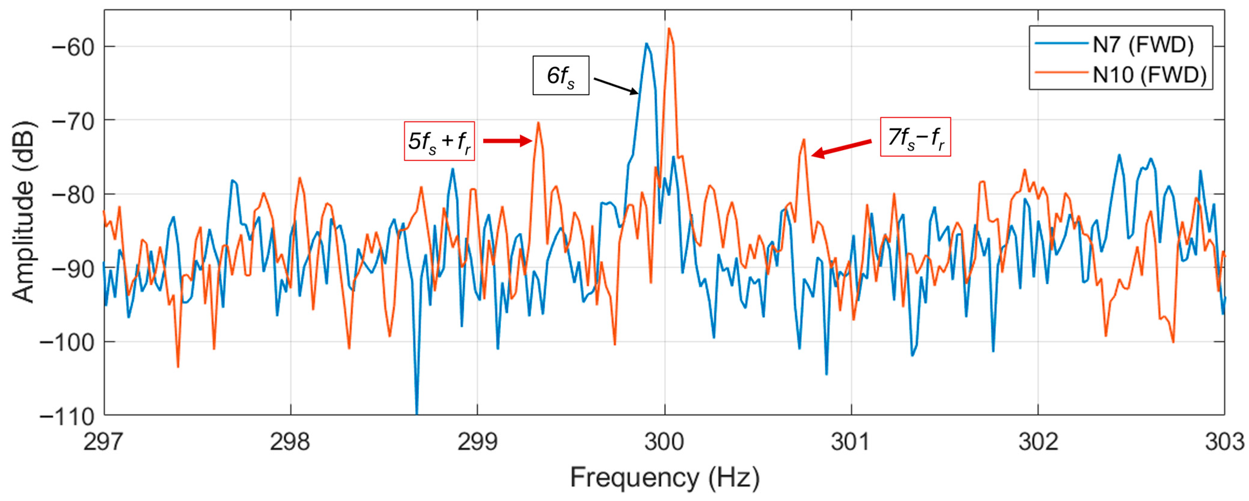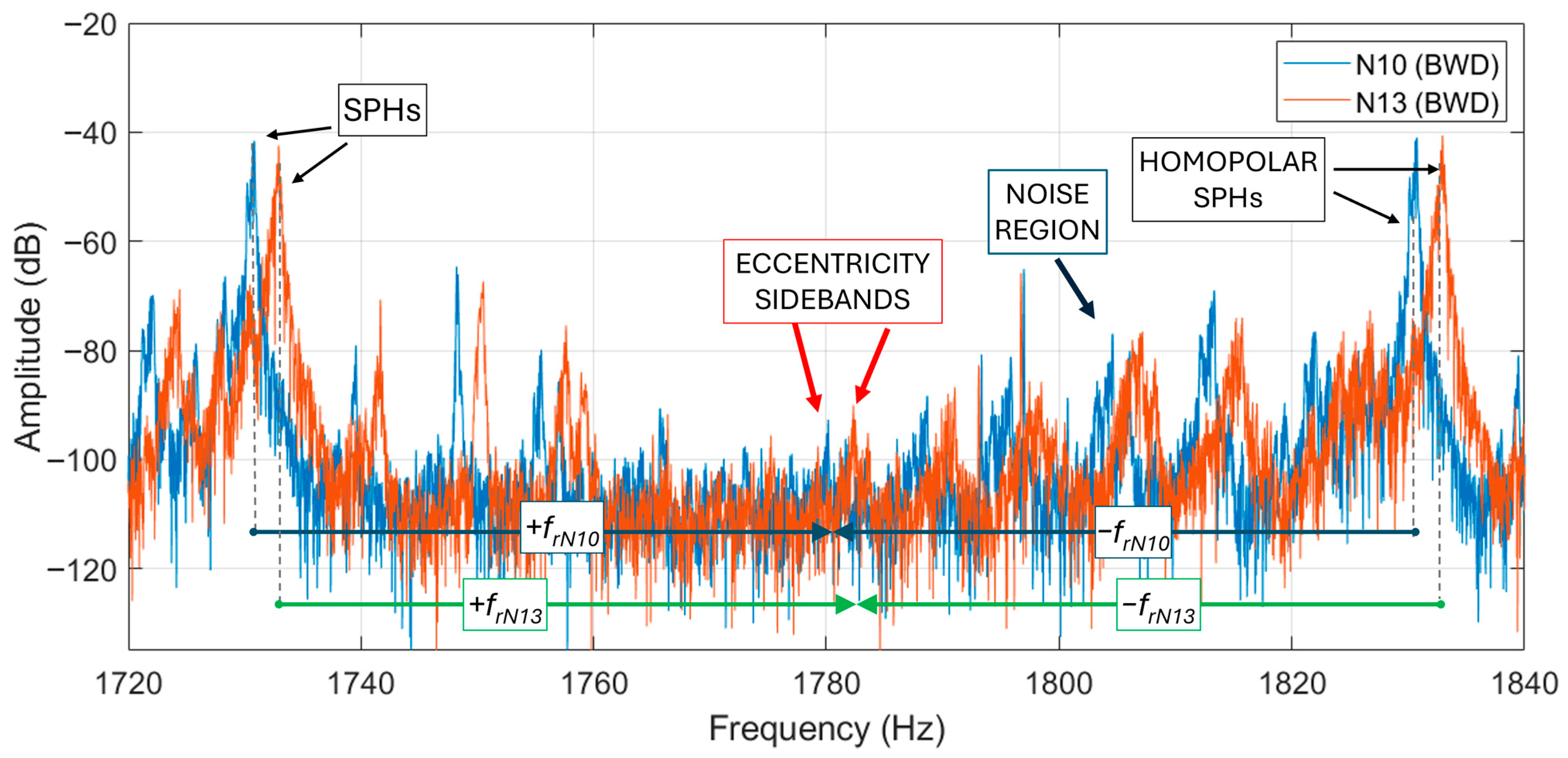 Figure 18. In the figure the second supply harmonic is visible at 100 Hz, whose amplitude is similar for both motors. However, the eccentricity harmonic is much higher in N10 than N7 motor (about 20 dB more), being even higher in amplitude than the 100 Hz harmonic of about 6 dB. In the authors’ opinion this comparative analysis, between two similar motors (if not equal), can highlight eccentricity problems in motor N10.
