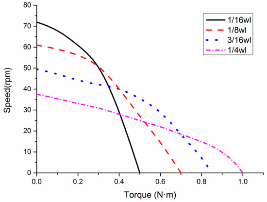In Figure 2, represents the stator wavelength, and is equal to the parameter . As can be seen from the figure, when the contact state between the stator and rotor is different (that is, the contact length is different), the motor can obtain different performance outputs. Through the comparison of several states, it can be known that when the contact length between the stator and rotor is , the motor obtains a better speed, but the torque is not ideal, and when the contact length between the stator and rotor is , the motor obtains a better torque, but the speed is poor.