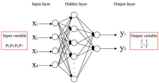 This paper establishes a BP neural network with a three-layer network structure. As shown in Figure 8, the input layer has four neurons, corresponding to four optimization parameters (P2, P5, P6, P7), respectively. The hidden layer is designed with 10 neurons, and the output layer has two neurons, corresponding to two objective functions (). All inputs are input to each neuron in the hidden layer after weighted summation, and the output of the hidden-layer neuron is generated under the action of the activation function. The activation function used is “hyperbolic tangent sigmoid” (tanh), which can linearly scale the input value to the interval [−1, 1] and effectively capture the nonlinear relationships between the optimization parameters and objective functions of the ultrasonic motor. This function is superior to the sigmoid function in avoiding gradient vanishing during training for our dataset. “Hyperbolic tangent sigmoid” is shown as expression (10):