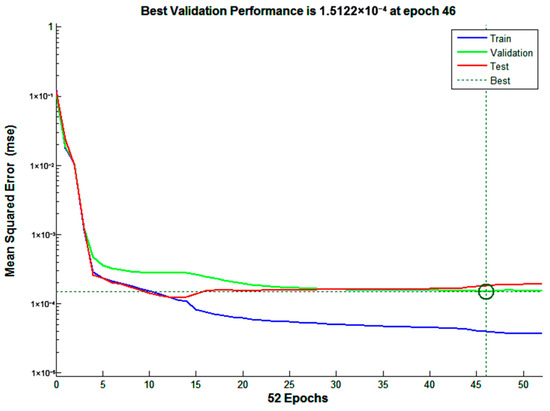A surface model based on BP neural network fitting was established using 50 design point data and target function values. This model reflects the mapping relationship between four optimization parameters and two objective functions. Along with 20 validation data points, the data were imported into Matlab 2018a software, and the Neural Network Toolbox was used to model, train, and validate the network model. Figure 9 shows the BP network training process, from which it can be seen that the mean square error tends to stabilize after the 46th training iteration, and the error decreases by more than three orders of magnitude.