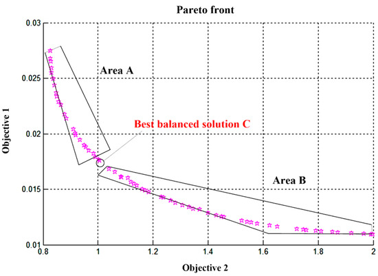 Considering that motor performance optimization is a mutually exclusive bi-objective optimization problem, and based on prior knowledge of motor performance, the optimal balanced solution in the Pareto solution set can be found using fuzzy membership functions (expressions (13)). The Pareto solution set can be divided into two regions with the optimal balanced solution as the boundary, as shown in Figure 12. In the figure, point C represents the optimal balanced solution, which is a trade-off between the two objective functions. Region A is identified as the Object1 optimal solution region, and Region B is identified as the Object2 optimal solution region. Due to the inverse relationship between Object1\ and Object2\, Region A is considered the torque-optimal solution region, and Region B is considered the speed-optimal solution region. The specific region selection depends on the design requirements of the decision-maker.