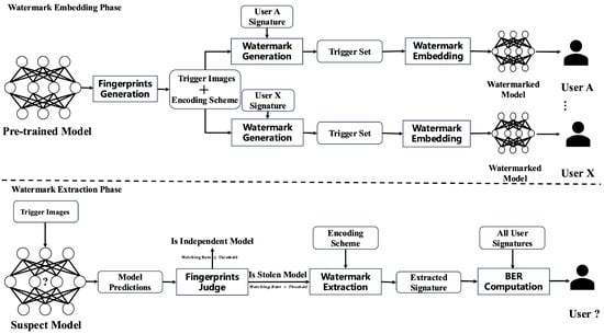 Model watermarking and model fingerprinting are two primary methods for protecting the intellectual property of models. Model watermarking involves embedding watermark information representing intellectual property during model training. In the event of copyright disputes, the watermark information is extracted to prove copyright ownership [12,13,14,15,16,17,18,19]. Depending on whether internal model information is required during extraction, it can be categorized into black-box watermarking and white-box watermarking. Since black-box watermarking only requires the model’s output results for verification, it has better application prospects compared to white-box watermarking. Traditional black-box watermarking is zero-bit watermarking, where a customized set of trigger templates is used for different models, and the presence of watermark information is determined based on the extent to which the classification results meet the criteria. Model fingerprinting, on the other hand, involves extracting unique fingerprint information representing the individual model after training. By comparing the fingerprints extracted from a suspicious model, it can be verified whether it is the host model or has a derivative relationship with the host model [20,21,22,23,24,25,26].