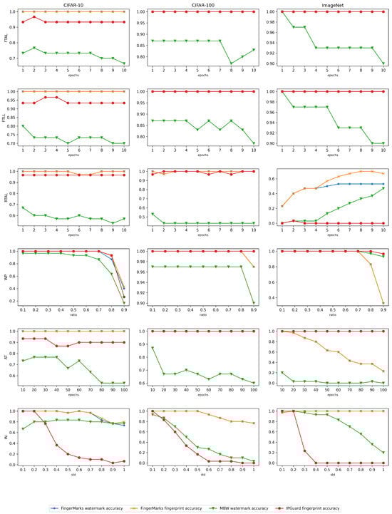 In both the FTAL and FTLL experiments, it can be observed that the verification accuracy of FingerMarks across three datasets at different fine-tuning epochs is higher than that of MBW. The robustness performance of IPGuard is comparable to FingerMarks, indicating that FingerMarks can maintain robustness on par with or even superior to IPGuard when defending against fine-tuning attacks, thereby achieving improved robustness compared to MBW. This is further highlighted in the RTAL experiment, where the watermark verification accuracy of MBW drops significantly under retraining attacks. Under identical conditions across the CIFAR-10, CIFAR-100, and ImageNet datasets, FingerMarks achieves approximately 25%, 15%, and 5% higher verification accuracy compared to the MBW method, respectively.