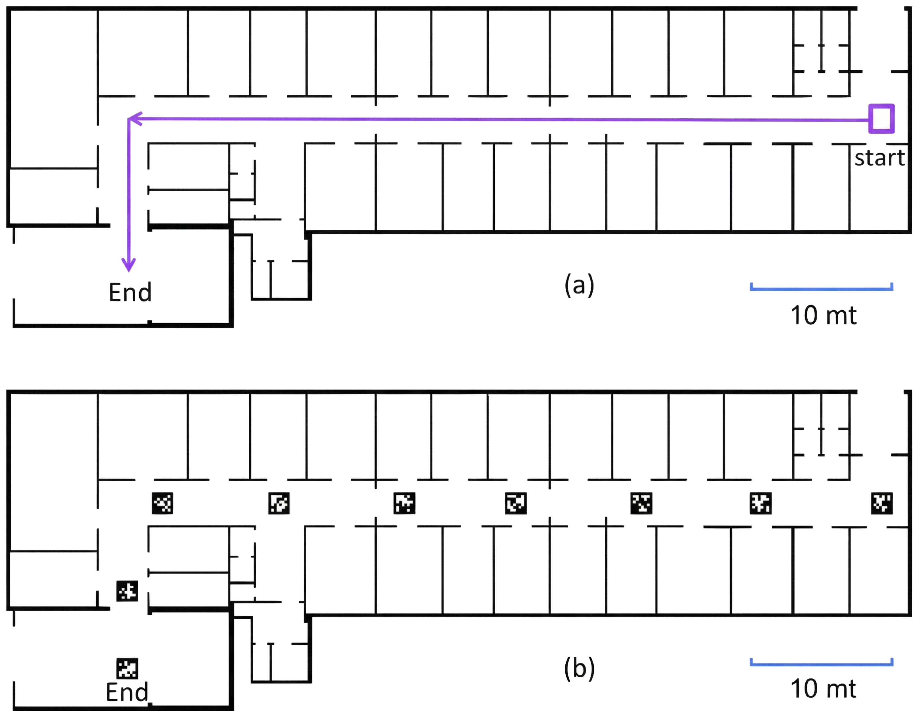 - Low lighting simulates a challenging, poorly lit daytime scenario, with all the corridor lights switched off and window curtains partially lowered to restrict natural light, with visual markers poorly illuminated, as they received only diffuse natural light, and partially shadowed by corridor objects.