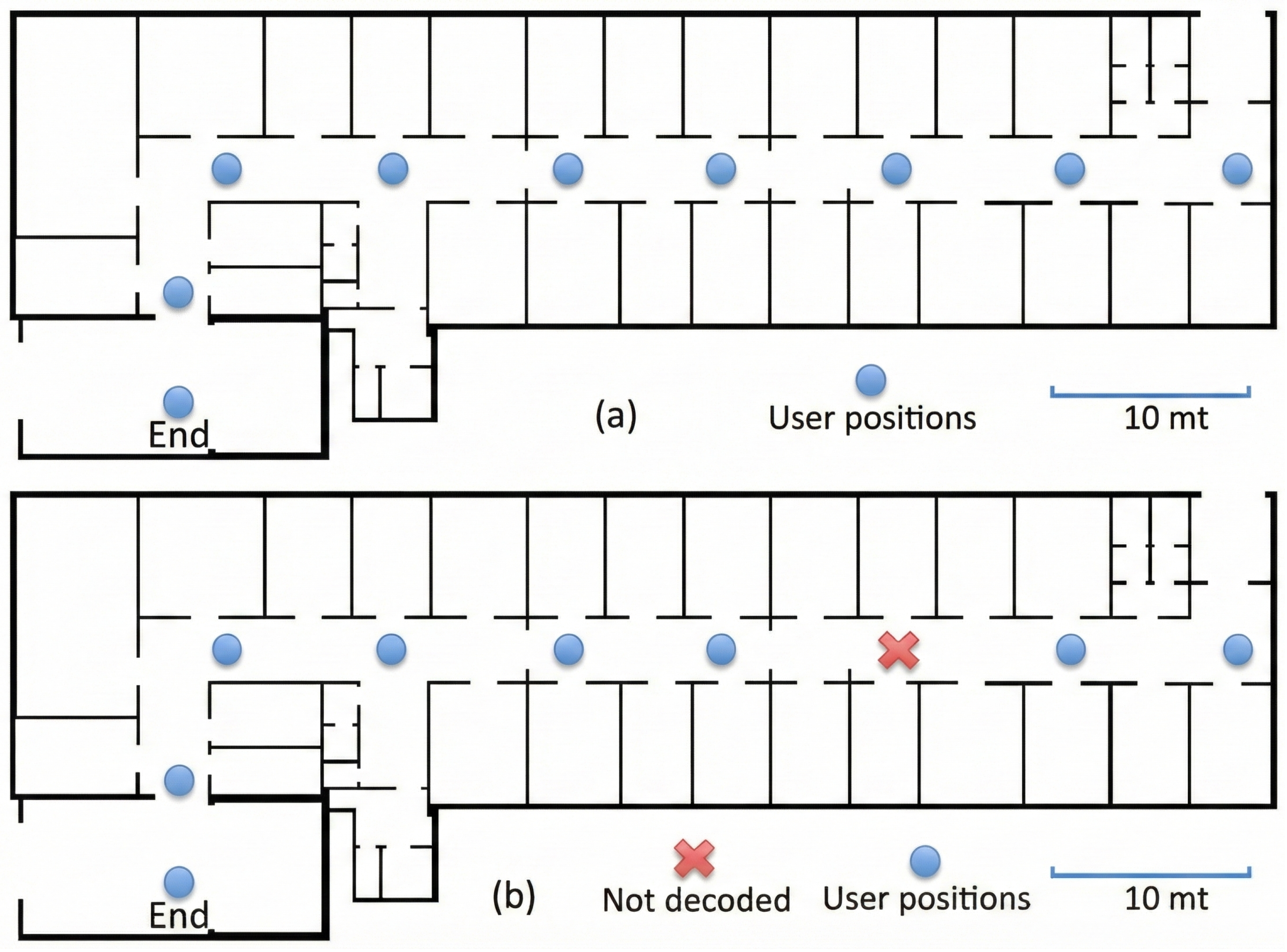 - The predetermined positions and spatial relationships of markers in the building layout enable sequence validation: given a detected marker, subsequent detections are constrained to spatially adjacent positions, allowing the system to reject spurious detections caused by decoding errors, improving overall reliability.