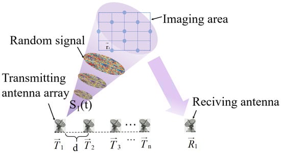 RCI is a radar imaging technique inspired by ghost imaging (GI) [4,5,6]. It uses multiple transmit antennas emitting time–space-independent, mutually uncorrelated random waveforms so that each target scatterer is tagged with unique random information in the echoes. By correlating the transmitted and received signals, the receiver reconstructs the target scattering distribution from a single pulse. Unlike traditional synthetic aperture radar (SAR) and inverse SAR (ISAR), which require relative motion to synthesize angular resolution, RCI achieves high-resolution imaging purely from the statistical independence of its random waveforms and is thus insensitive to transmitter–receiver motion, enabling short imaging times, independence from target dynamics, and relaxed requirements on uniform angular sampling. Moreover, RCI offers high sensitivity [7,8], super-resolution capability [4,9], and strong robustness to complex scattering [4,10], and it has been applied to three-dimensional imaging, remote sensing, multispectral imaging, and atmospheric turbulence imaging.