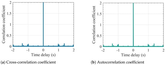 Correlation coefficient of the transmitted signal. (a) Cross-correlation coefficient; (b) autocorrelation coefficient.